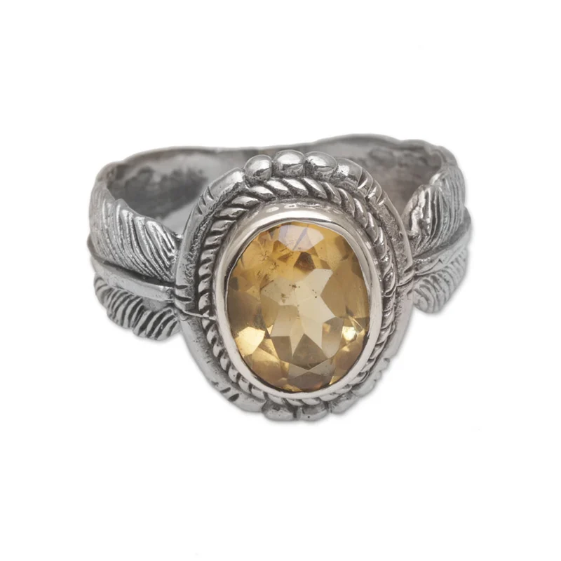 Komang Suastra designs and crafts cocktail ring with the light grace of a bird, wings outstretched and held aloft by warm gusts of wind. An intricately detailed band depicting a feather wraps around your finger, while a rope-motif setting holds a faceted, citrine. The ring represents modern Balinese fashion.