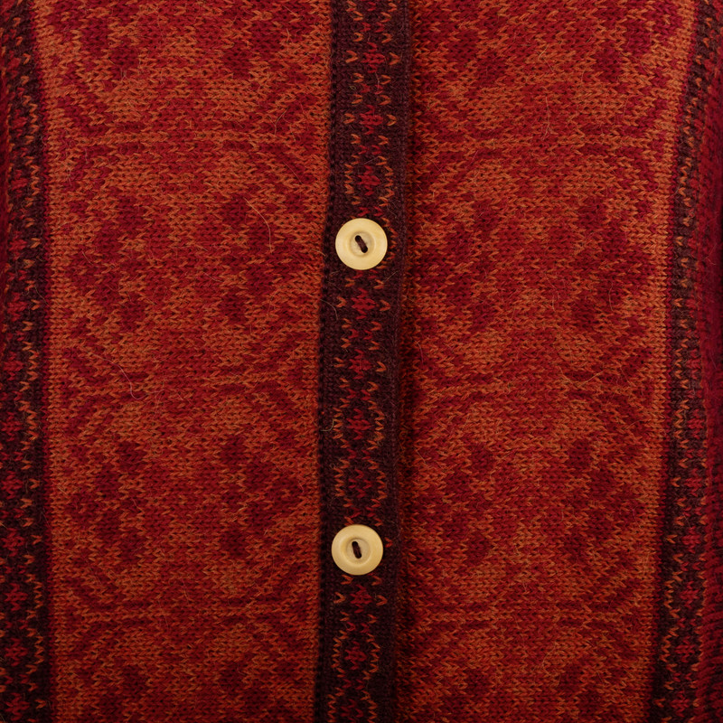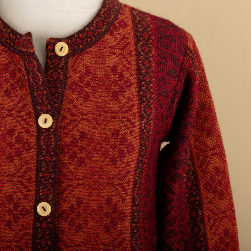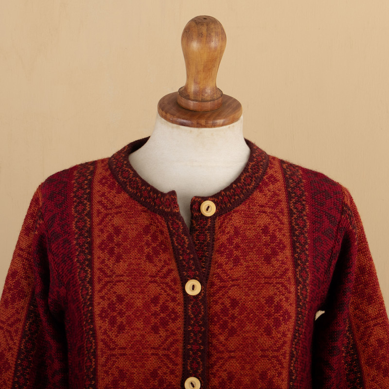 By Fernando Cano, this radiant sweater in shades of red evokes poinsettia flowers. He works in luxurious alpaca wool, long prized for its lightweight warmth. With its intricate geometric motifs and cardigan styling, it closes with cedar wood buttons.