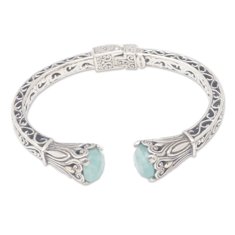 Backed by our 100% Happiness GuaranteeNature inspires a breathtaking creation made in Bali using traditional techniques that allow an intricate pattern full of magic and mysticism. Artisan Dewi Putera adds traditional motifs and little spirals to this sterling silver cuff bracelet, finishing the structure with 18k gold-plated accents for a sublime style. On top of that, Dewi crowns the accessory with faceted amazonite stones totaling six carats, both strongly related to success and luck.