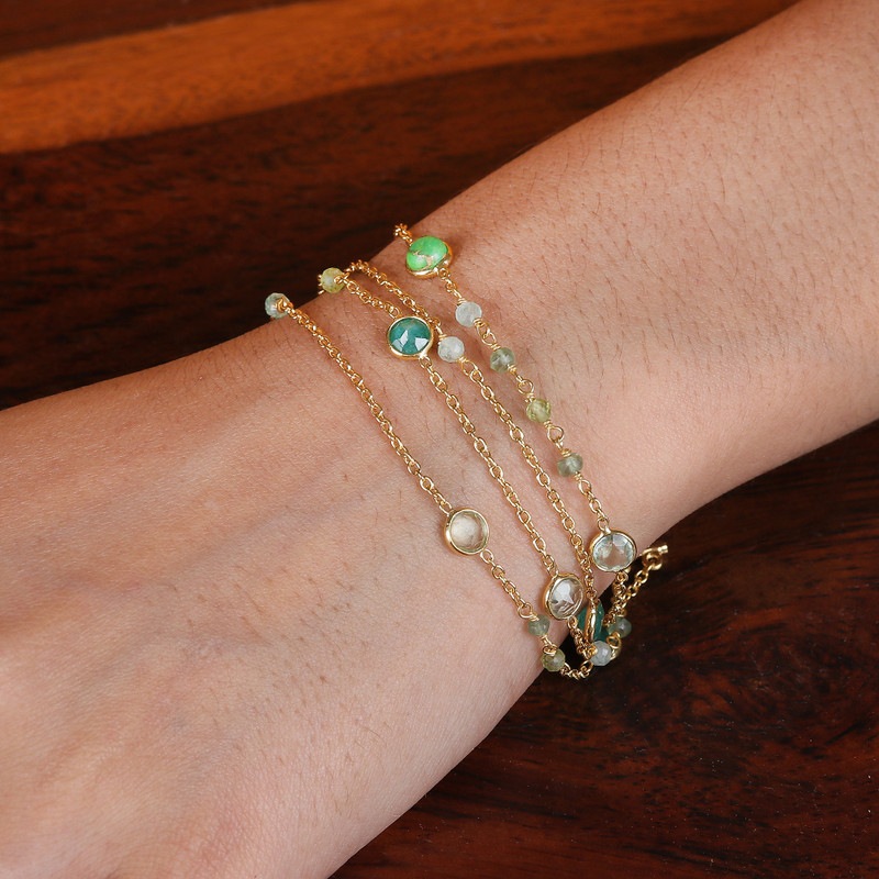 Prepare to be spellbound by this awe-inspiring bracelet that exudes undeniable luxury. Shimmering 18k gold-plated strands create a precious canvas that showcases vivid beryl, prasiolite, turquoise, aventurine and apatite stones, hypnotizing the eye with their harmonious dance of hues and textures. Whether adorning your wrist for a night out or adding radiant sparkle to your everyday look, this chic accessory from Indian artisan Neetu Barathi promises to bewitch all who catch its captivating gleam.