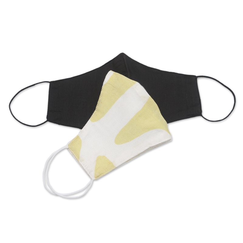 A lemon-yellow print on white evokes dappled sunlight while a sophisticated solid black recalls midnight's shadows. Working in luxurious Thai silk, Hari and Arthur craft an elegant pair of face masks. Both are contoured for comfort and fit, are double-layered, are washable and reusable, and have elastic to loop over the ears.
