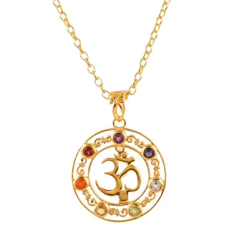 Furthermore, seven faceted gemstones in a round cut rest in the accessory, each representing one of the seven chakras: amethyst, the stone of wisdom, as the crown chakra; carnelian, the stone of confidence, as the sacral chakra; peridot, the stone of prosperity, as the heart chakra; garnet, the stone of perseverance, as the root chakra; iolite, the stone of intuition, as the third eye chakra; blue topaz, the stone of righteousness, as the throat chakra; and citrine, the stone of success, as the solar plexus chakra.