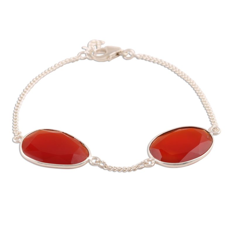 Fiery in their beauty, two twin gemstones of natural carnelian are showcased in this Indian station bracelet. Designed by Hema, this six-carat bracelet is crafted with frames and chain of high-polish sterling silver.