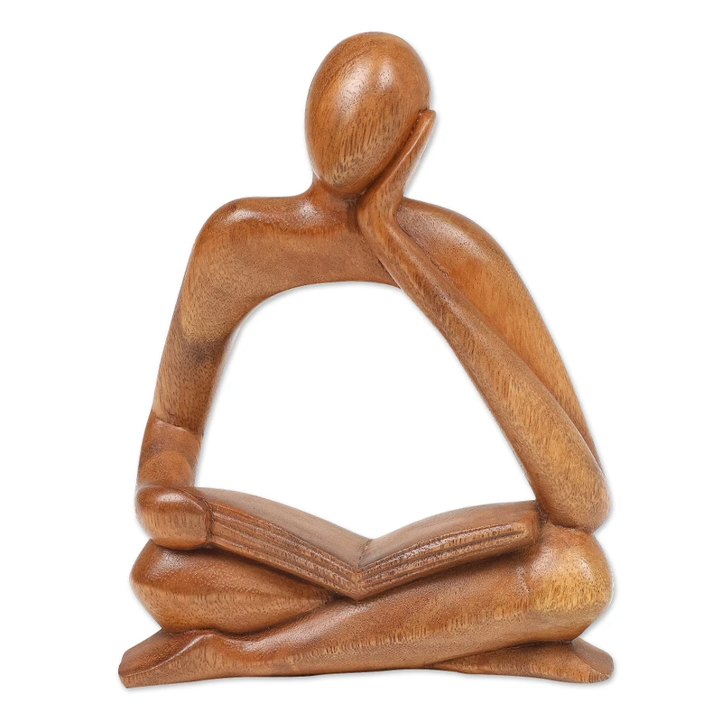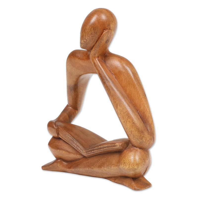 Backed by our 100% Happiness GuaranteeLost in contemplation, a figure finds solace with an open book on his lap, his head gently cradled in one hand. Hand-carved with precision from suar wood in Bali, this abstract and modern sculpture breathes life into the ethereal. Presented by Eka, the wood is polished to perfection and radiates with a mesmerizing glow, adding to the design's uniqueness and allure.
