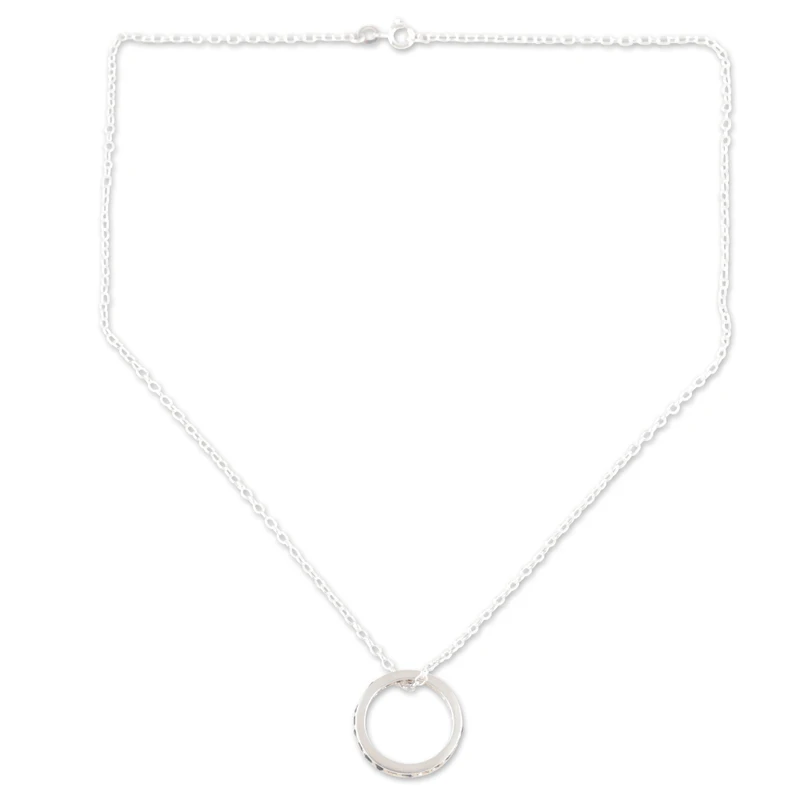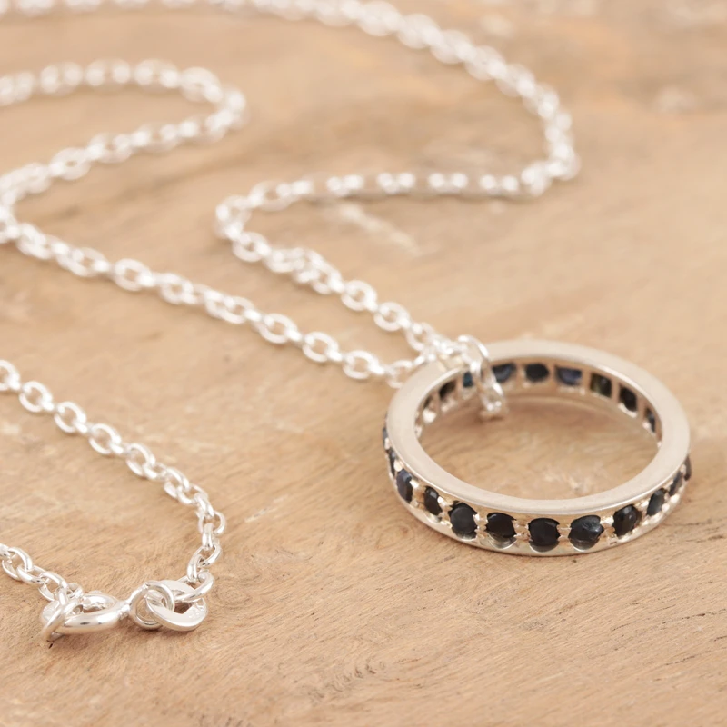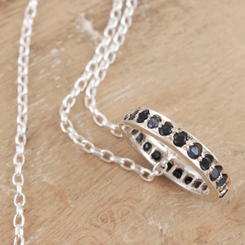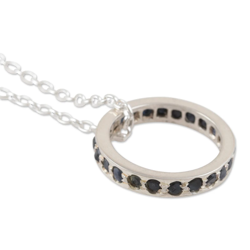 centreing a sleek cable chain, a ring hosts scintillating blue sapphires. The pendant evokes an unending circle of love in this necklace by Bhavya Jain. Her lovely sterling silver design is bathed in radiant rhodium.