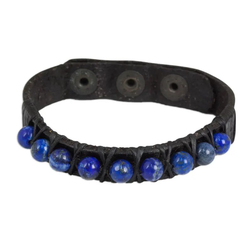 Beads of lapis lazuli shimmer with a royal blue glow in this leather wristband bracelet from Thailand. Chaloemphon hand crafts this dark brown bracelet from high quality leather to create this stunning accessory. It features three brass snaps for adjustable length.