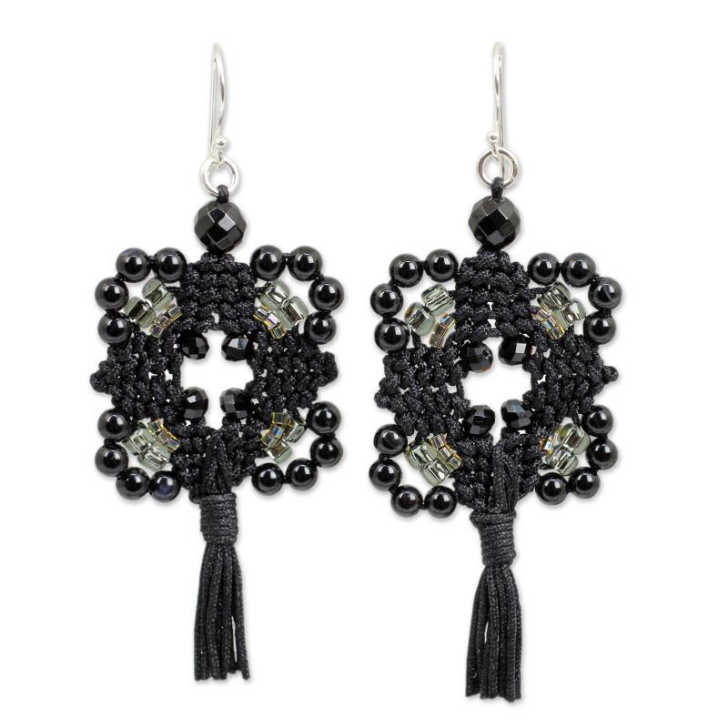 Square crosses in black macramé evoke Gothic elegance, Thai style. Designed by Kai Kittima, the earrings are crafted by hand with onyx and glass beads. They are worn on sterling silver hooks.