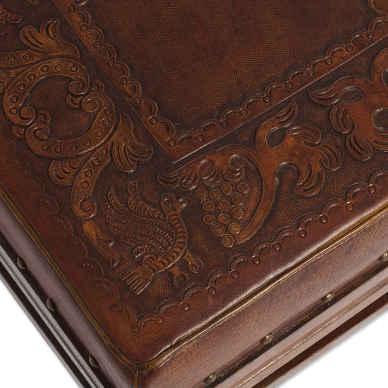 Peru's Rios Family artisans are proud to offer this example of their remarkable leather work. Made of mohena wood and richly hand-tooled leather with a grape and bird motif and brass studs, its design is inspired by intricate saddlework of the colonial era.