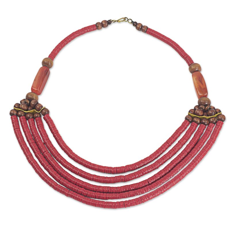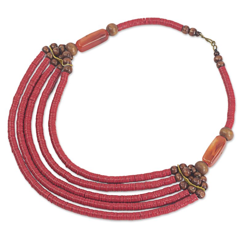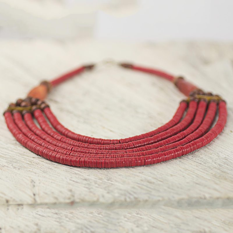 Backed by our 100% Happiness GuaranteeGhana's Ila Suleyman crafts a necklace featuring five beaded strands threaded with red recycled vinyl beads. The ends of the multi-strand section are finished with sese wood beads, agates, and leather strips serving as spacers. The brass hook clasp complements the beads' warm tones. The name Wend Panga comes from the Mamprusi word meaning "strong will."