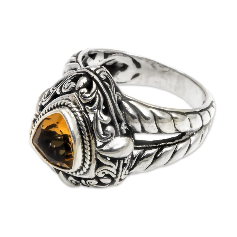 Cast your own spell with this enchanting golden citrine cocktail ring from Kadek Hendra. The Balinese artisan crafts the ring from sterling silver, adding florid vine motifs around the bezel. Two rope-style bands are joined into one to complete the design.