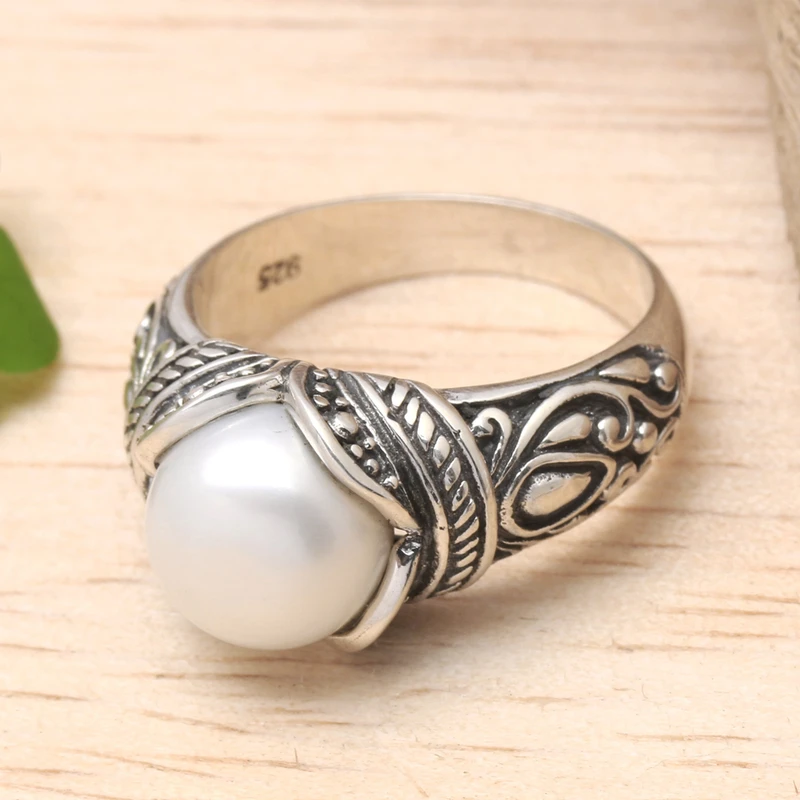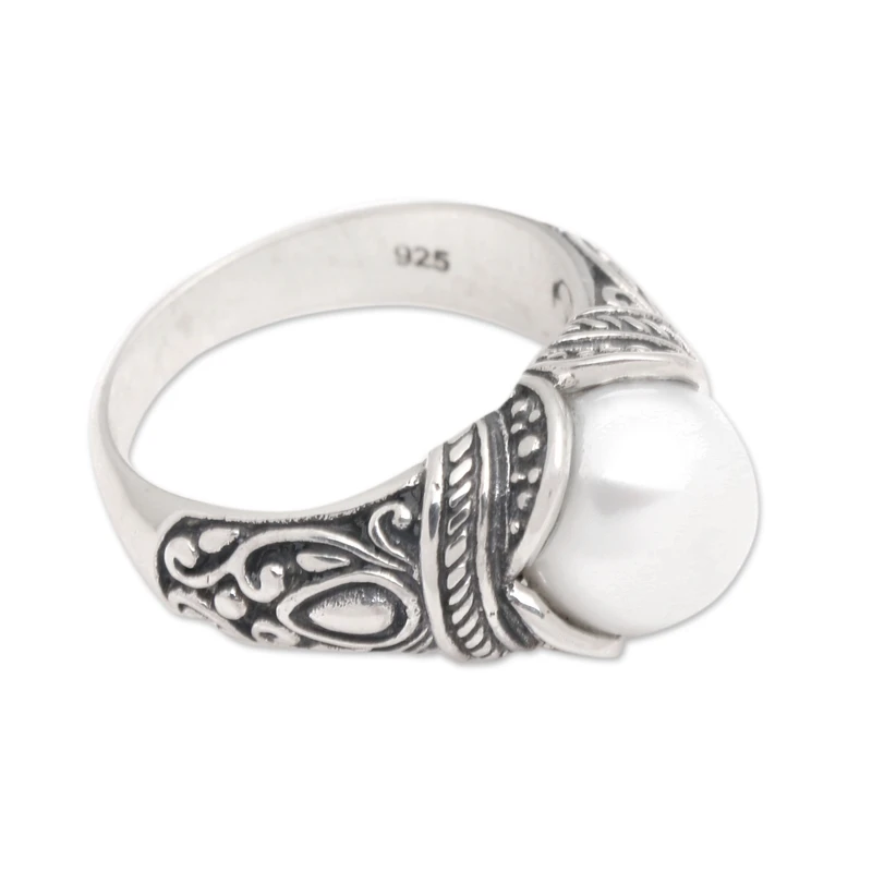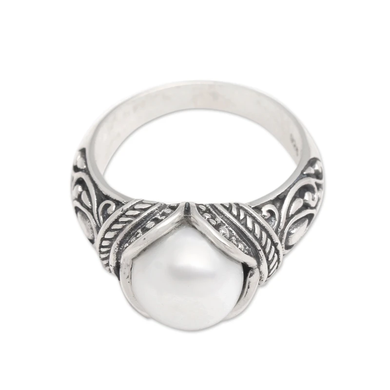 Like a luminous white blossom, a cultured pearl crowns this lovely sterling silver ring. Wirabhuwana crafts it by hand, demonstrating his artisan skills and a knowledge of Balinese design traditions.