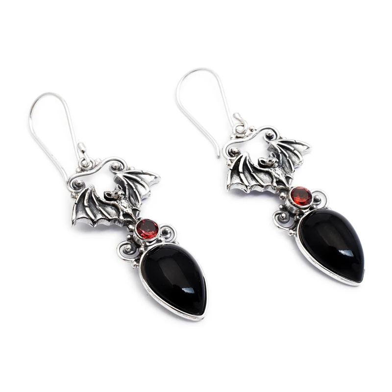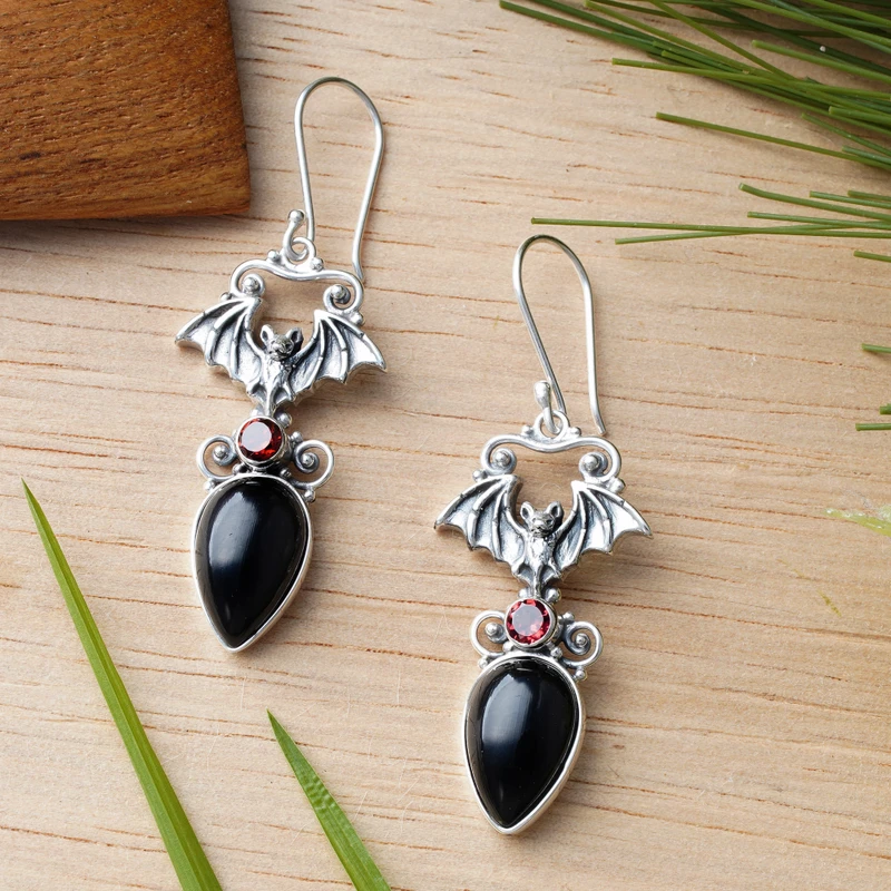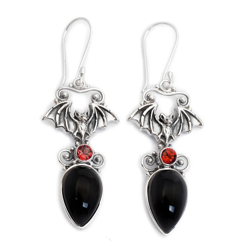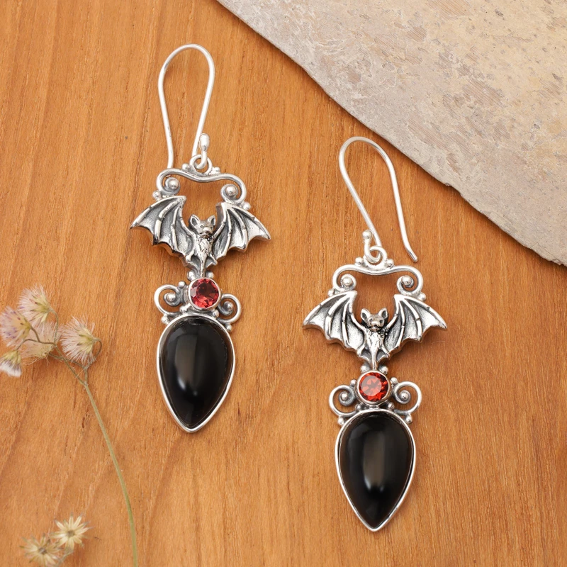 Dare to wear this pair of unparalleled bat-themed dangle earrings designed only for those who love bold, unique pieces of jewellery. Balinese artisan Ayu Ary creates these striking earrings crafted from buffalo horn, sterling silver and natural garnet gemstones.