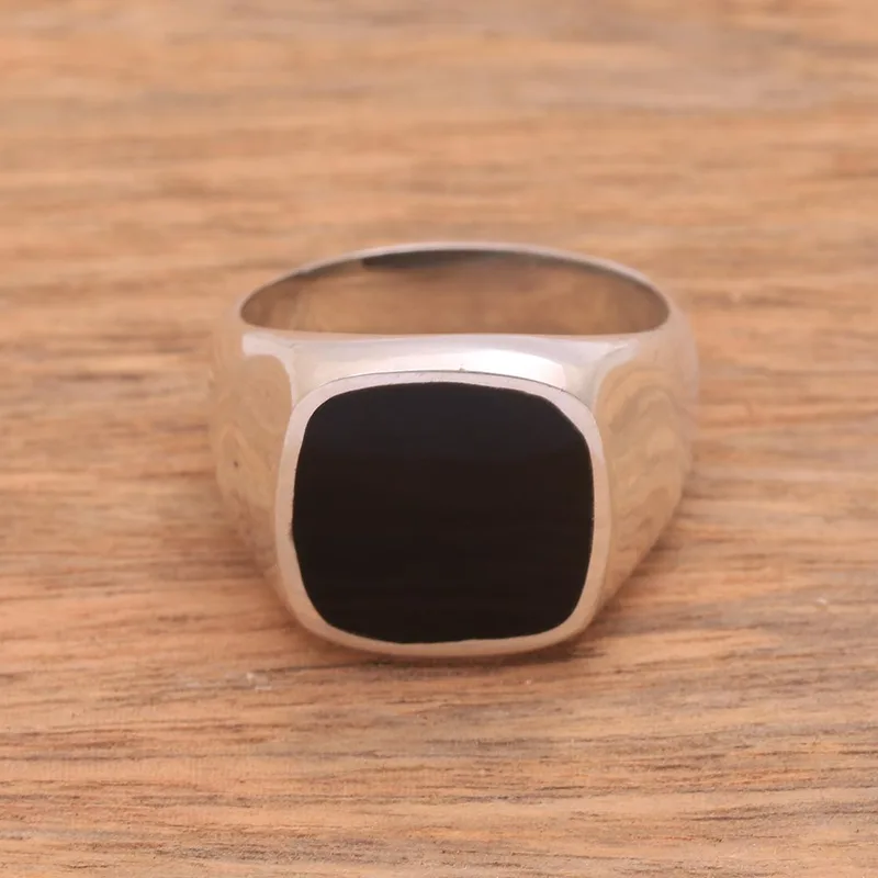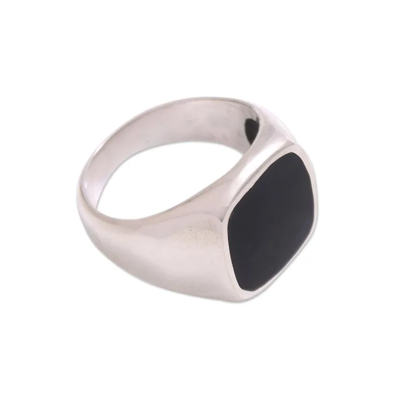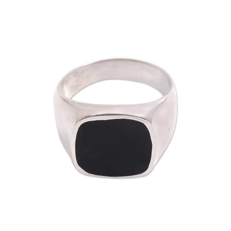 Komang Suastra of Bali forms black resin into a sleek square with rounded edges, crowning this striking signet ring from Bali. The ring circles the finger with a polished band of sterling silver.