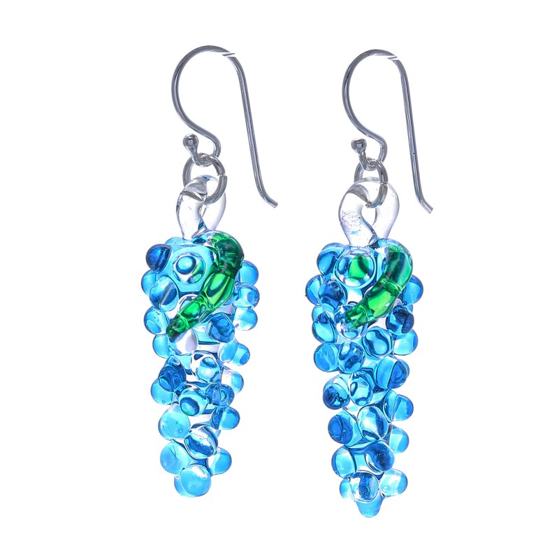 Immerse yourself in the beauty of handblown glass artistry with these dangle earrings masterfully crafted by Panapai in Thailand. The grape-inspired, abstract design takes form through meticulous shaping and adornment, with the clear glass canvas exquisitely decorated with hand-painted azure and green pigments. Suspended from lustrous sterling silver hooks, these enchanting accessories sway with grace, infusing your ensemble with a subtle yet captivating glamor.