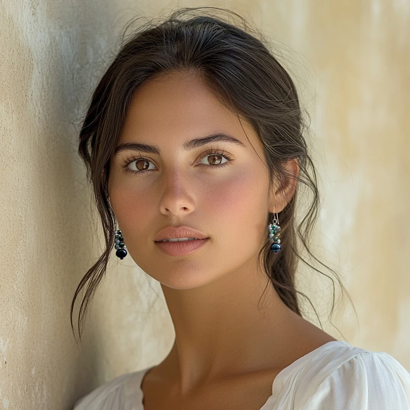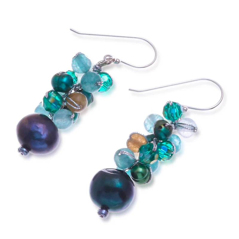 By carefully selecting complementary shades of green from polished quartz and faceted glass beads, Thailand's Nareerat creates these dangle earrings in an homage to the winter season. The beads are gathered on silk thread and bundled together with cultured freshwater pearls before they are set atop blue-green peacock pearls that call to mind the Aurora Borealis. The earrings hang on sterling silver hooks.
