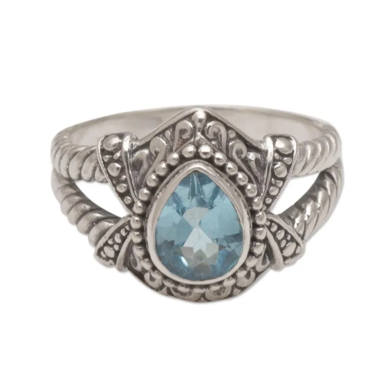 A dazzling faceted pear blue topaz sits at the heart of this gorgeous solitaire ring by artisan Kadek Hendra. Intricate petal and stud motifs grace the front of the ring, and an alluring spiral design adorns the sides. The village of Celuk is celebrated worldwide as being the Balinese home of master gold and silversmiths.