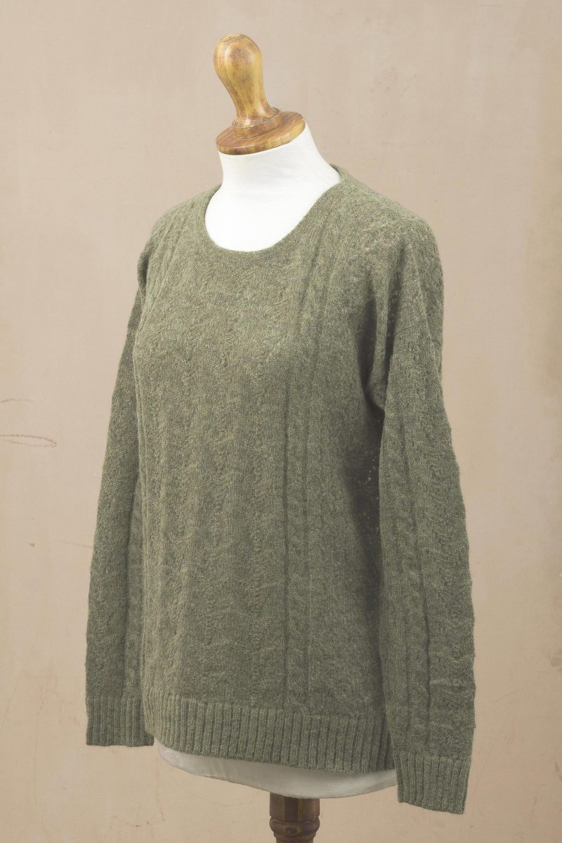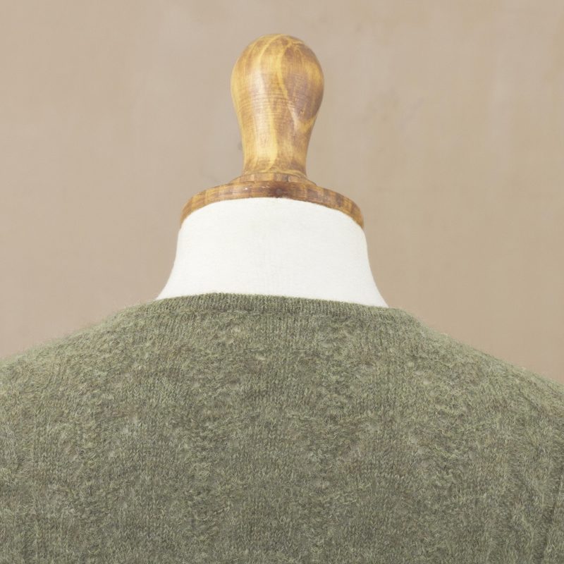 Keeping you warm during the cold months, this fashionable cardigan from Peru is knit from a baby alpaca blend in olive green. Wilber Calapuja creates the pullover, which features cable knit and openwork patterns, long sleeves, and a drop shoulder. Baby alpaca refers to the fine fleece from the season's first shearing.