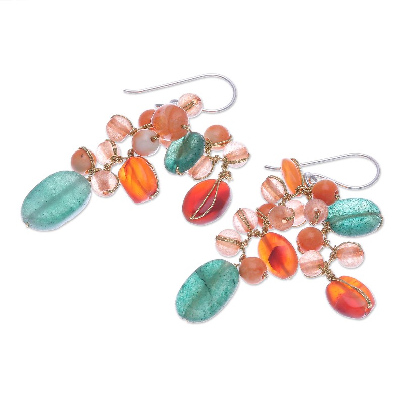 Backed by our 100% Happiness GuaranteeNareerat's bright and cheery dangle earrings are perfect for a warm, sunny day. To craft the earrings, the Thai artisan hand knots shimmering silk thread around clusters of orange carnelian beads and green quartz stones. Elegant sterling silver hooks finish the pretty pair with a touch of cool shine.