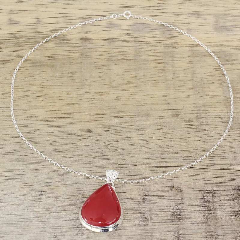 The shape and style of this carnelian pendant is pure elegance! I am very glad I purchased it and it goes perfectly with other carnelian jewelry I have.