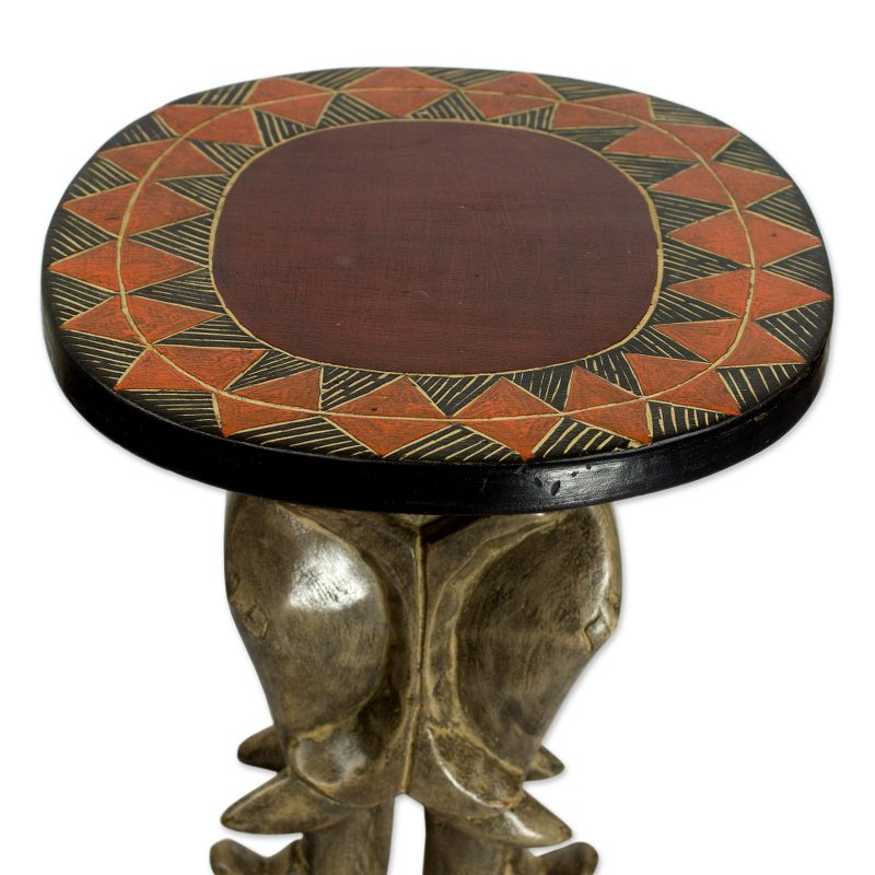 Ghanaian artisan Raphat Asigbey crafts a striking accent table with a round top hand-carved of cedar wood. Shaping the base in the form of two elephants' heads, he completes the table with hand-painted motifs. Finally, Asigbey gives the end table a rustic finish for a charming addition to any home.