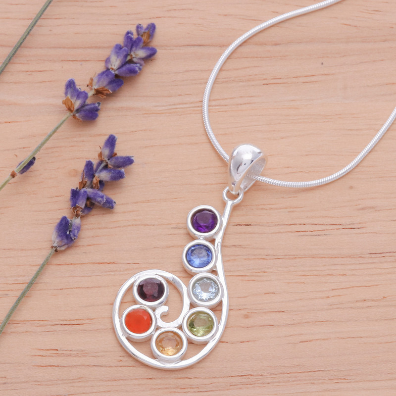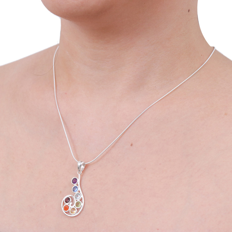 A jewel for each chakra centre—Abhishek Singla's newest pendant necklace invites you to live in harmony and peace with an ethereal creation by Thai artisans. The team works with sterling silver to create this necklace, whose spiral pendant holds faceted amethyst, iolite, blue topaz, peridot, citrine, carnelian and garnet jewels.