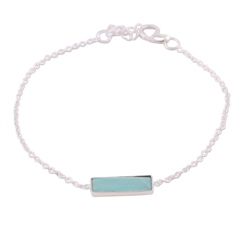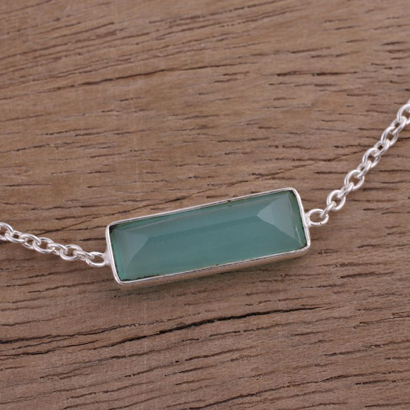 Backed by our 100% Happiness GuaranteeAn elegant, rectangular prism of dyed blue-green chalcedony weighs over three carats, featured at the center of this Indian pendant bracelet. Designed by Neetu Barathi, the bracelet decorates the wrist on a length of adjustable sterling silver cable chain.