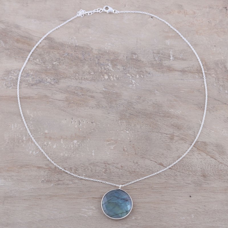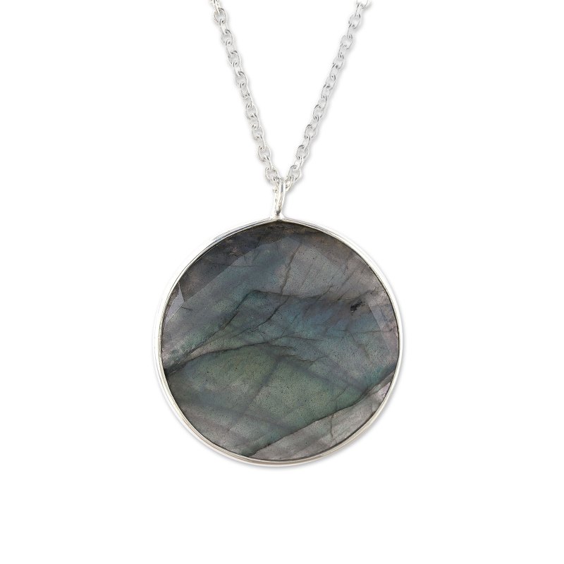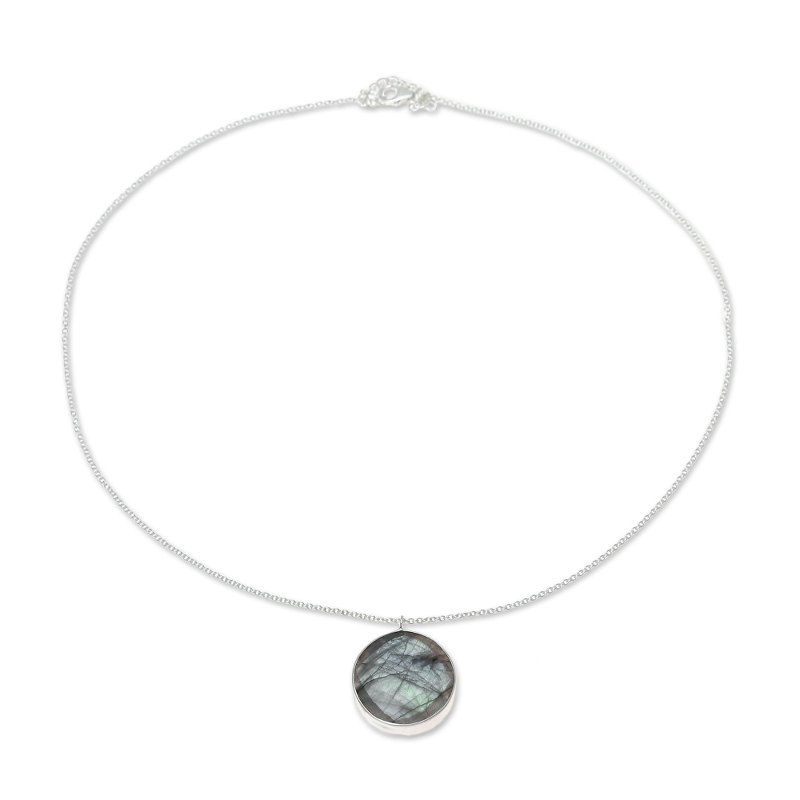 Weighing nine carats, a faceted disc of labradorite evokes the moon in this pendant necklace from India. Believed by the Inuit to possess the hues of the Aurora Borealis, the stone is framed by sterling silver. Neetu Barathi designs this necklace from India.