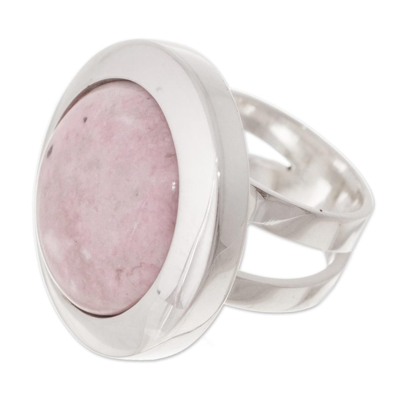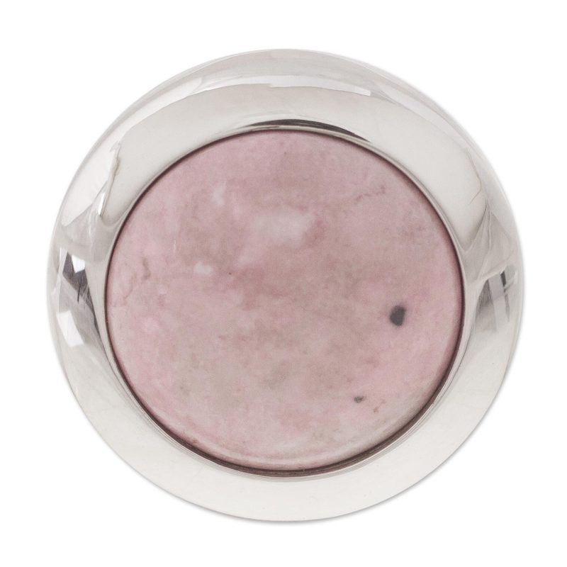 Backed by our 100% Happiness GuaranteeFramed by a ring of high-polish sterling silver, a circular cabochon of rhodonite possesses a soft pink energy. Carmen Anocibar from Peru designs this cocktail ring, which circles the finger with a simple sterling band.