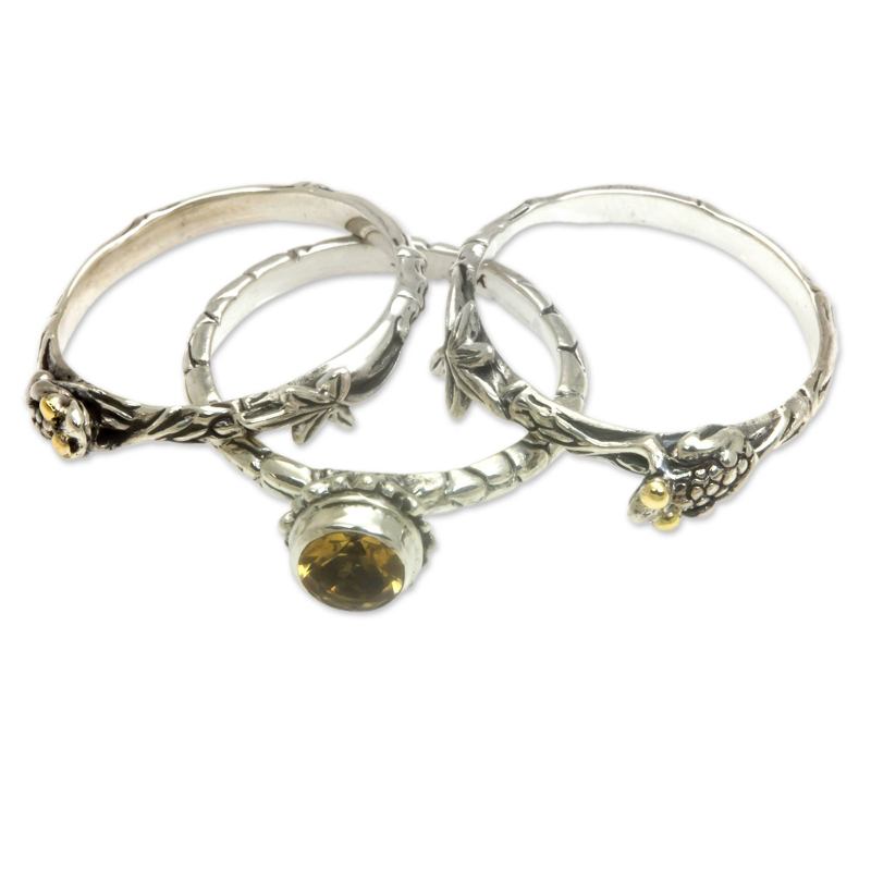 Backed by our 100% Happiness GuaranteeWhimsical tree frogs with 18k gold plated eyes croak cheerfully on sterling silver rings handcrafted by Kadek Hendra. Designed to be worn together or separately, a third ring is set with faceted citrine.