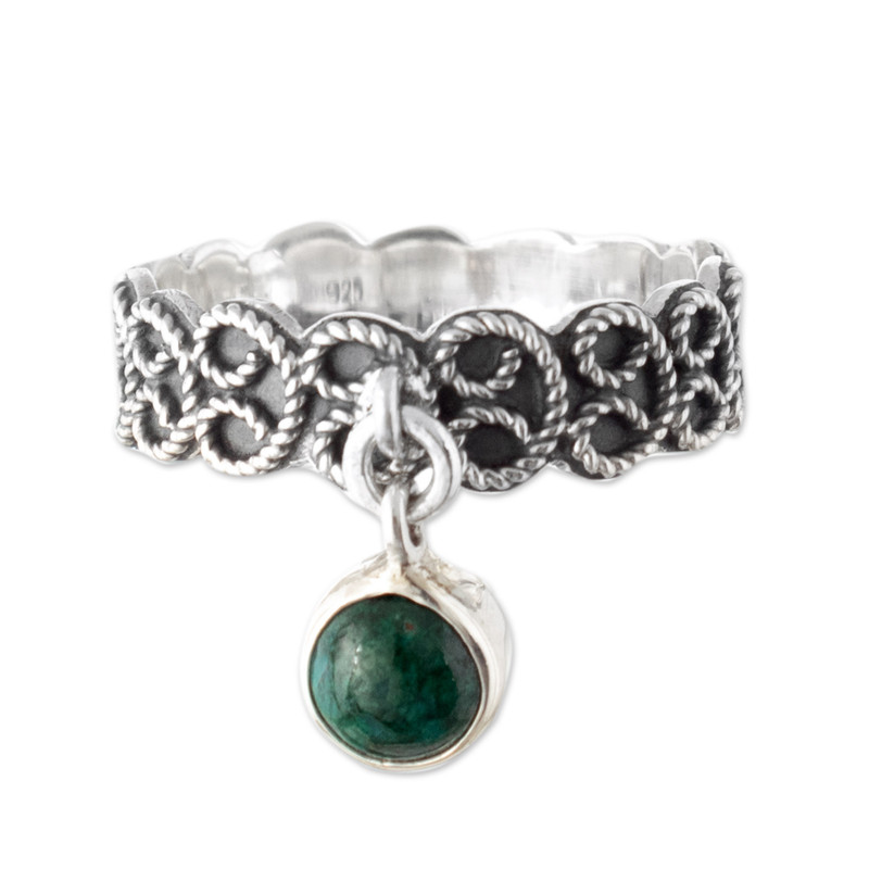 A natural chrysocolla stone dangles from a classic design crafted by the talented hands of artisan Nancy Quispe. Working in Peru, the artist draws inspiration from traditional themes to create the sterling silver structure of this charm ring, adding a polished finish for a glamorous look. On top of that, the jewel has a hidden meaning: its green tone symbolizes nature, intuition and peace.