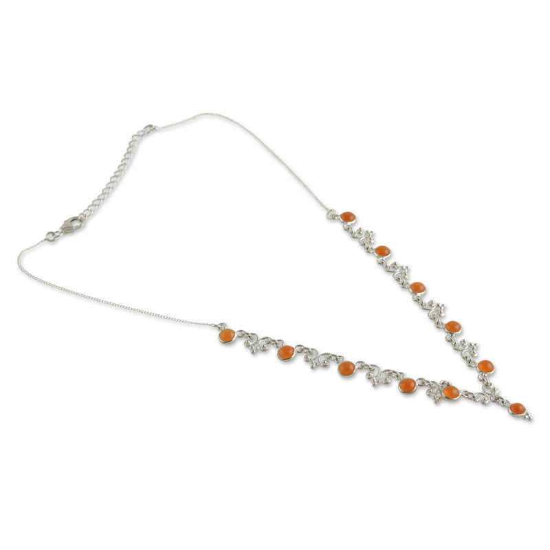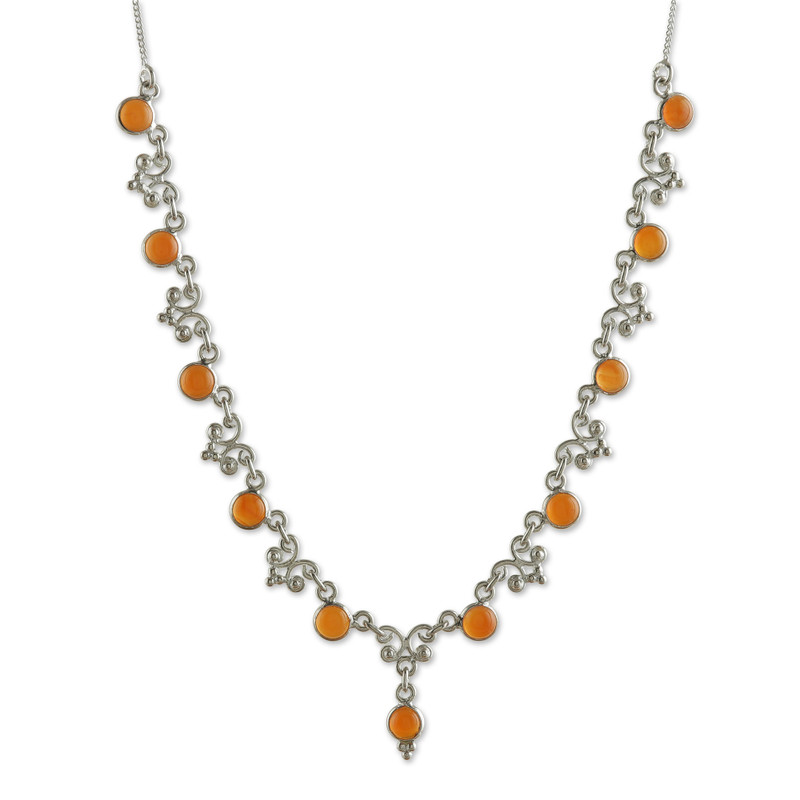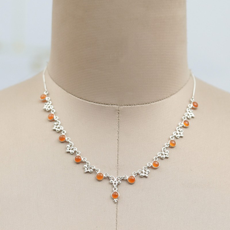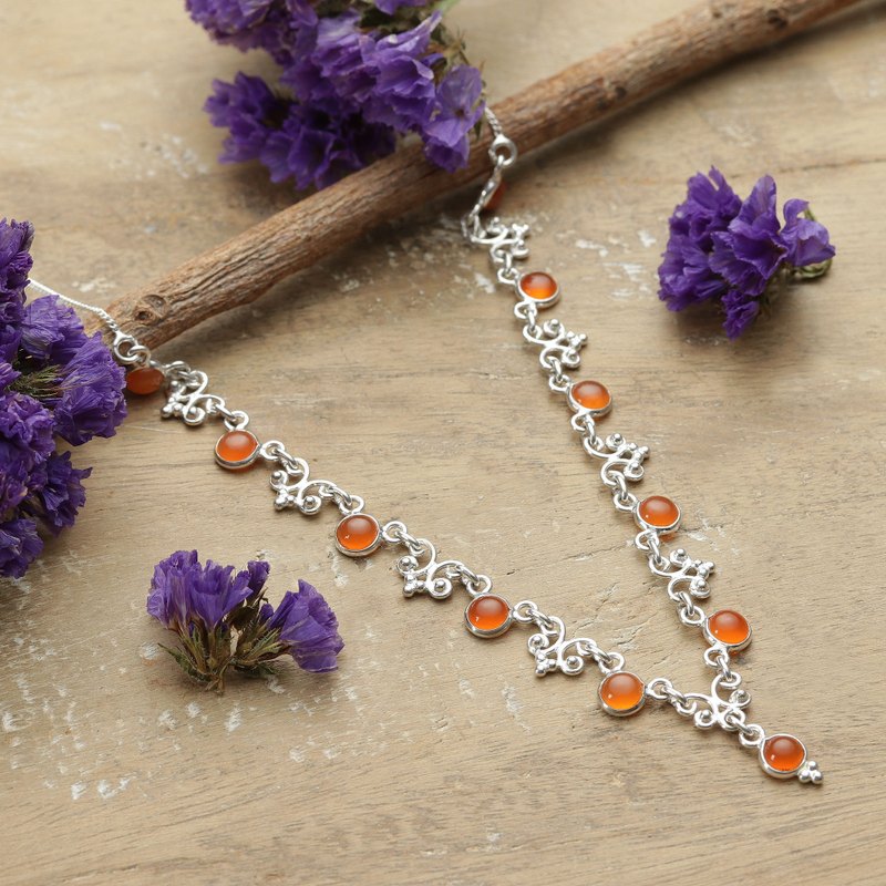 The glory of the traditional Hindu dynasties survives the passage of time through jewellery artworks such as this sublime design by Bhavya Jain of India. The artisan uses sterling silver to create this classic link necklace, whose high polish finish enriches each of the carnelian jewels set around the accessory as a symbol of fiery beauty.