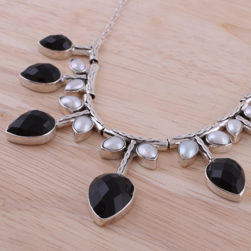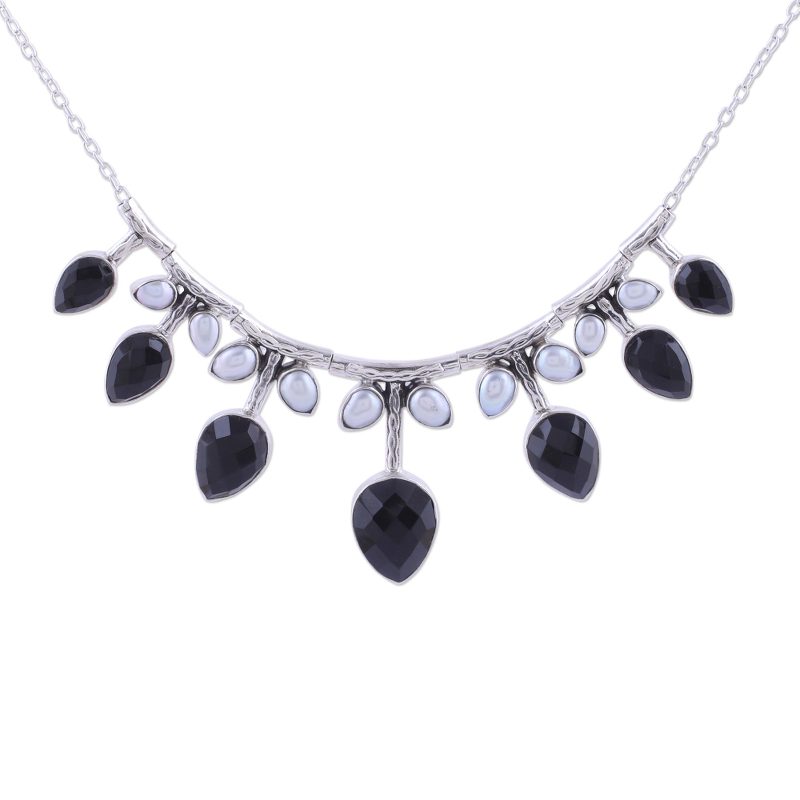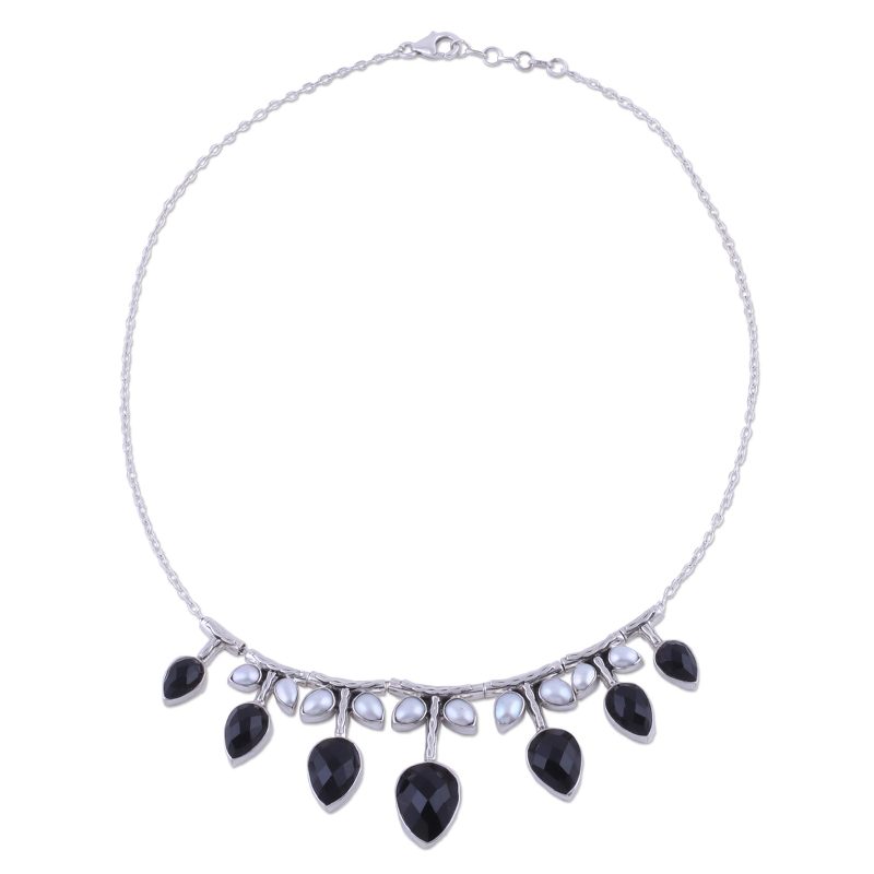 Seven sterling silver cylinders suspend faceted black onyx and pale grey cultured pearls in this statement necklace from Babun Dey. Cut in checkerboard style and varying in size, the onyx gems stand in stark contrast to the smooth pearls clustered at the bases of the braid-patterned stems that hold them. Starting from the largest onyx gem in the middle, the necklace forms a pleasing symmetrical style as it extends outwards.
