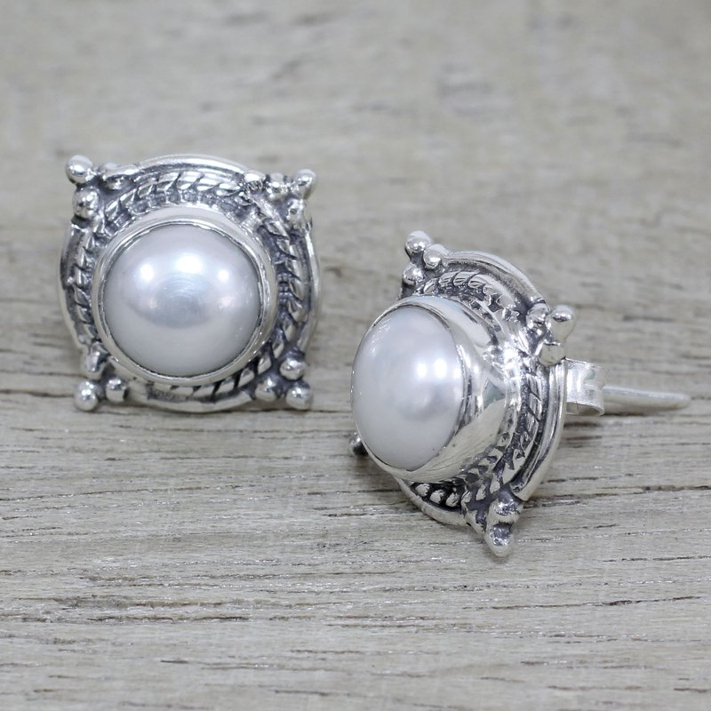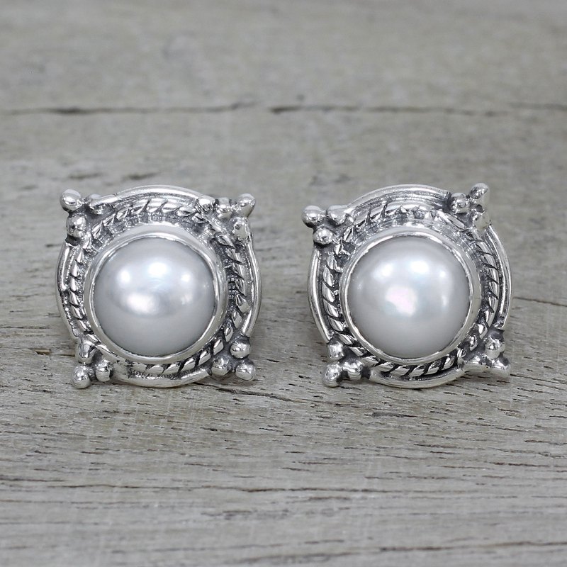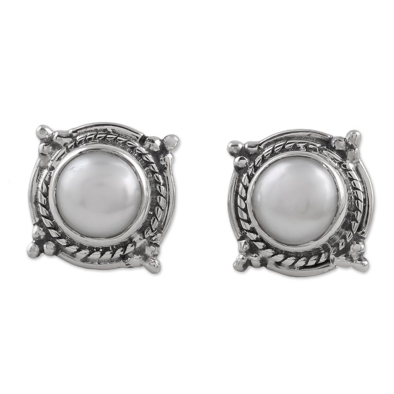 Framed by sterling silver rope and dot motifs, this pair of button earrings graces the ears with an elegant glow. Neeru Goel presents these crown-like button earrings from India, centreed by cultured pearls.
