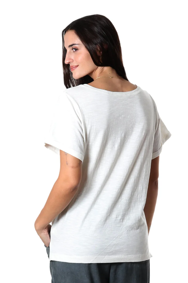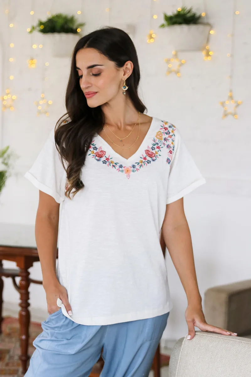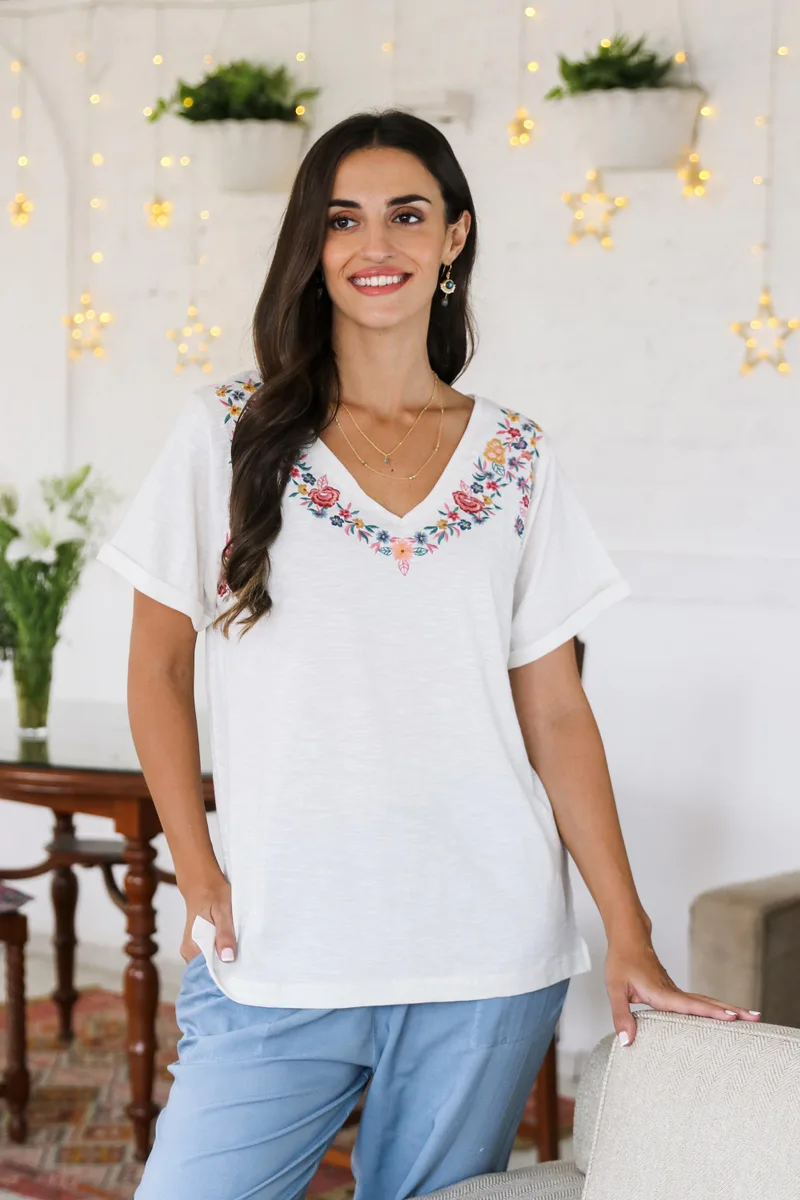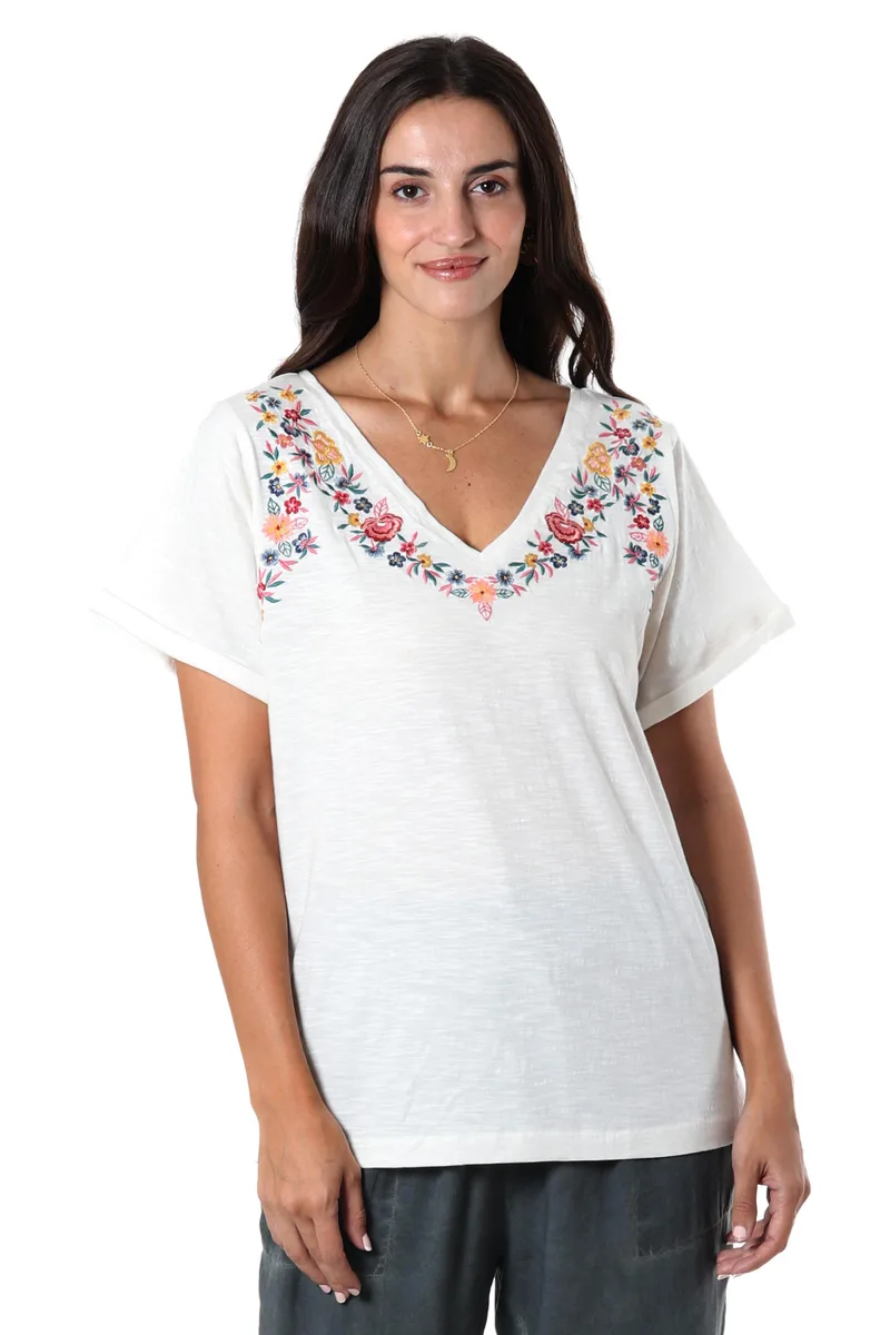 Feast your eyes on this charming v-neck t-shirt presented by Sonik Sethi. Crafted by Indian artisans from 100% cotton jersey fabric, the off-white top features a colourful embroidered floral motif along the neckline, and lateral slits for extra comfort.