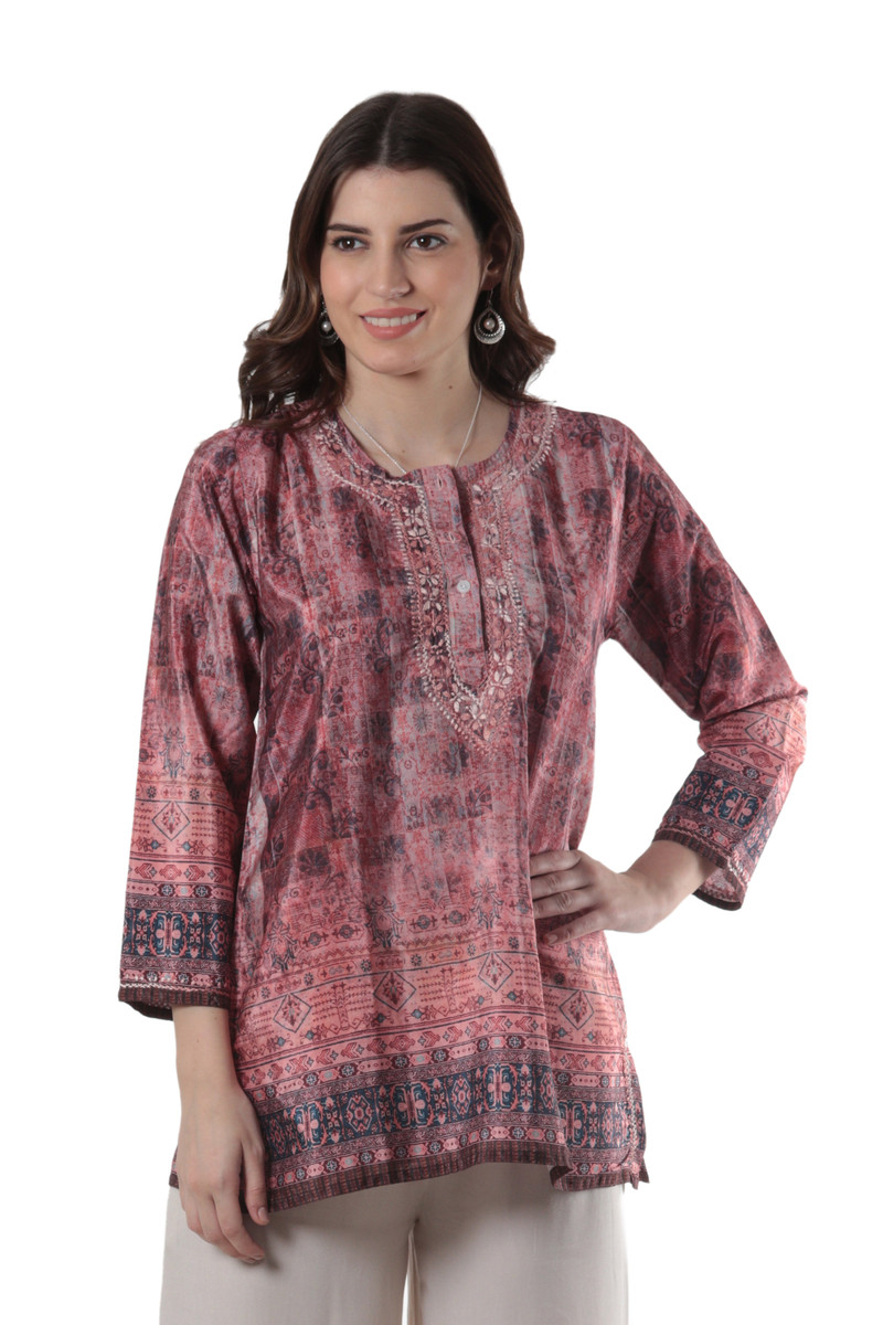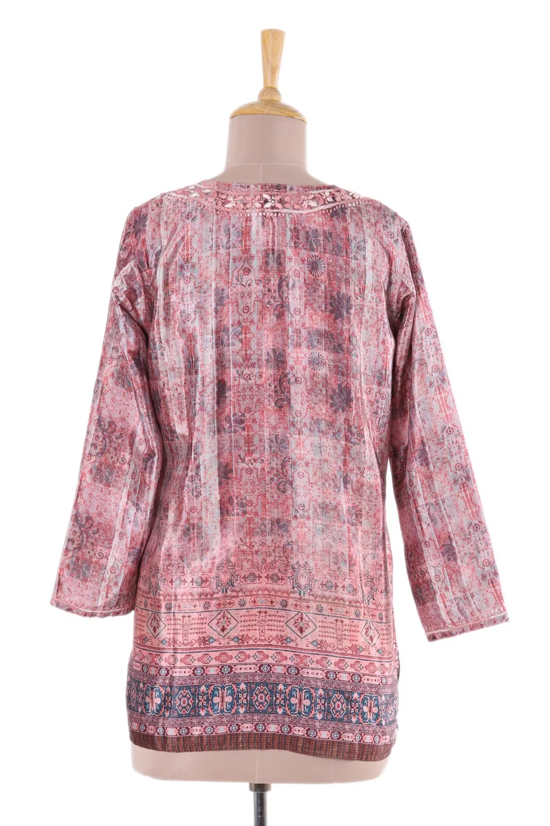 Backed by our 100% Happiness GuaranteeIntricate flower and vine patterns inspired by 19th-century textiles grace this petal-pink tunic. The designs are digitally printed to evoke the well-loved look of heirloom weavings. Cotton embroidery along the button neckline are a nod to the exquisite chikankari embroidery work of artisan Shalabh's hometown of Lucknow.
