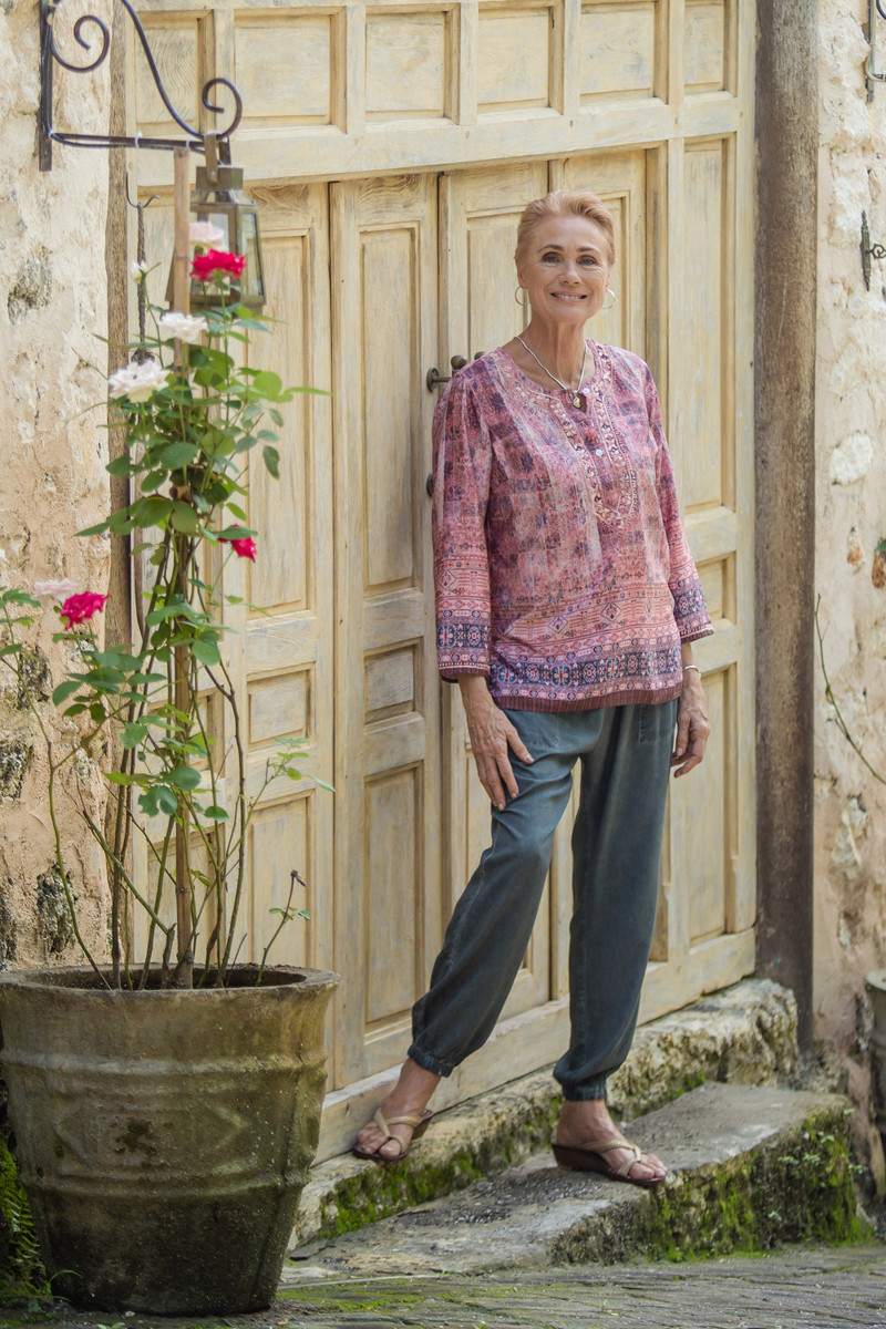 This blouse is lovely and comfortable. I took it with me the last time I visited my mother in Oregon, and she liked it so much that I ended up giving it to her; I ordered another when I returned home.