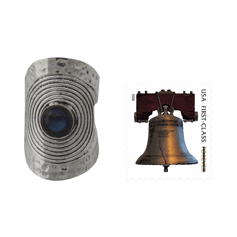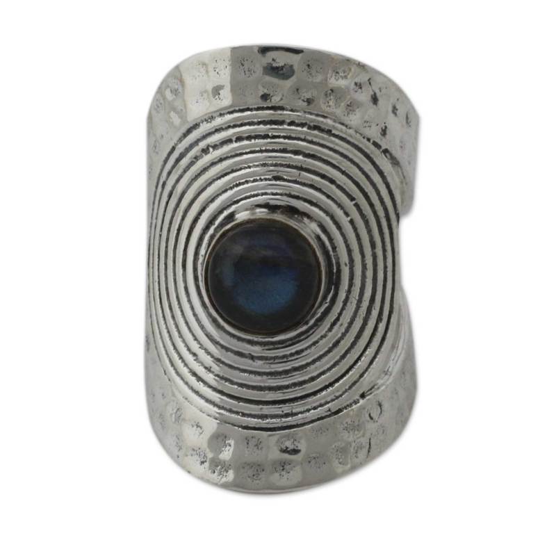 Concentric circles surround a single misty labradorite like a halo. Chintan presents a beautiful ring that wraps around the finger, evoking a shield of hammered silver.