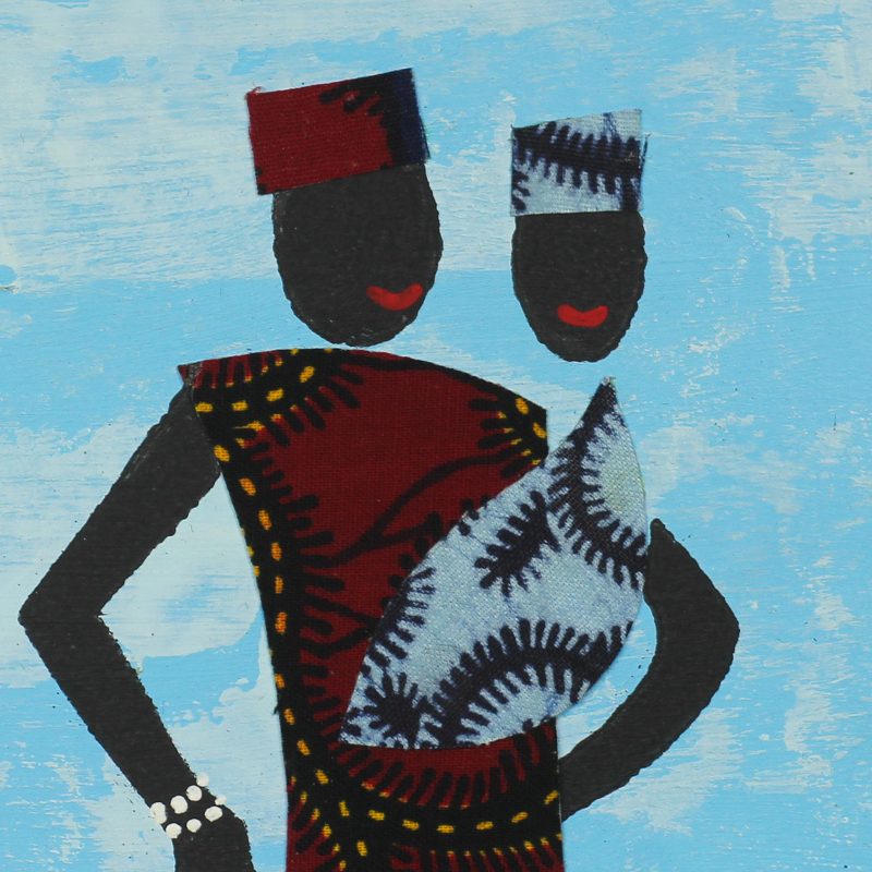 Standing proudly, an African father shows off his child. Ghanaian artist K. Baka paints this composition, depicting his subjects in stark black against an abstract background of blue and white. The father wears cotton clothing printed with traditional African motifs in red and black, while the child wears blue and black printed clothing. This painting arrives in a mat passe-partout.