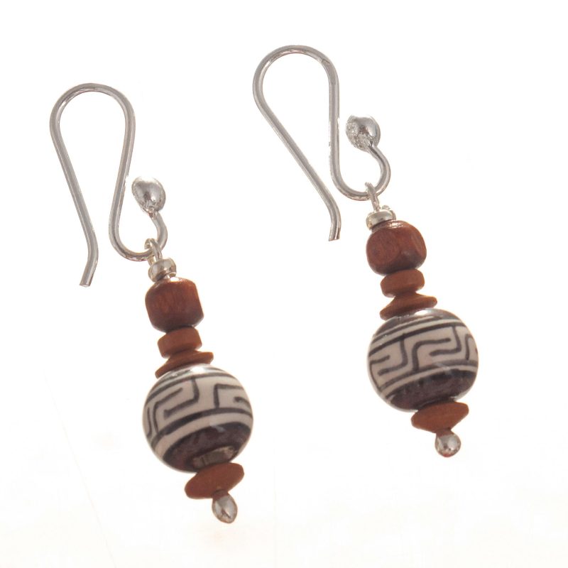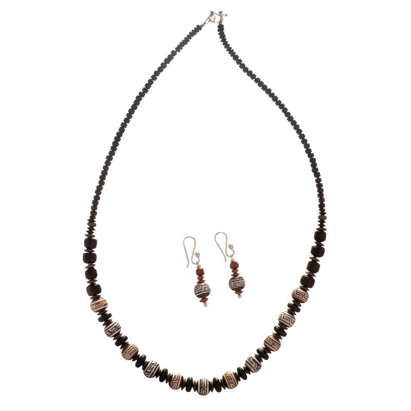 Peruvian artisan Dina takes pride in her country's centuries-old ceramics traditions and translates them into exquisite jewellery. This necklace and earring set features ceramic beads in cacao and beige with Inca-inspired geometric patterns, with hooks and a clasp of sterling silver.