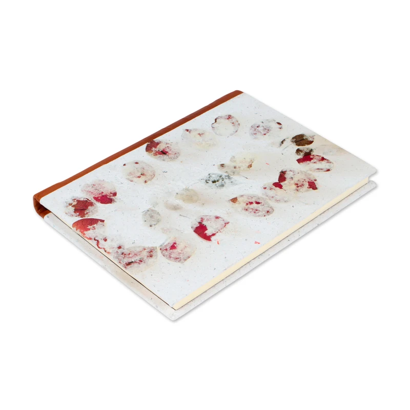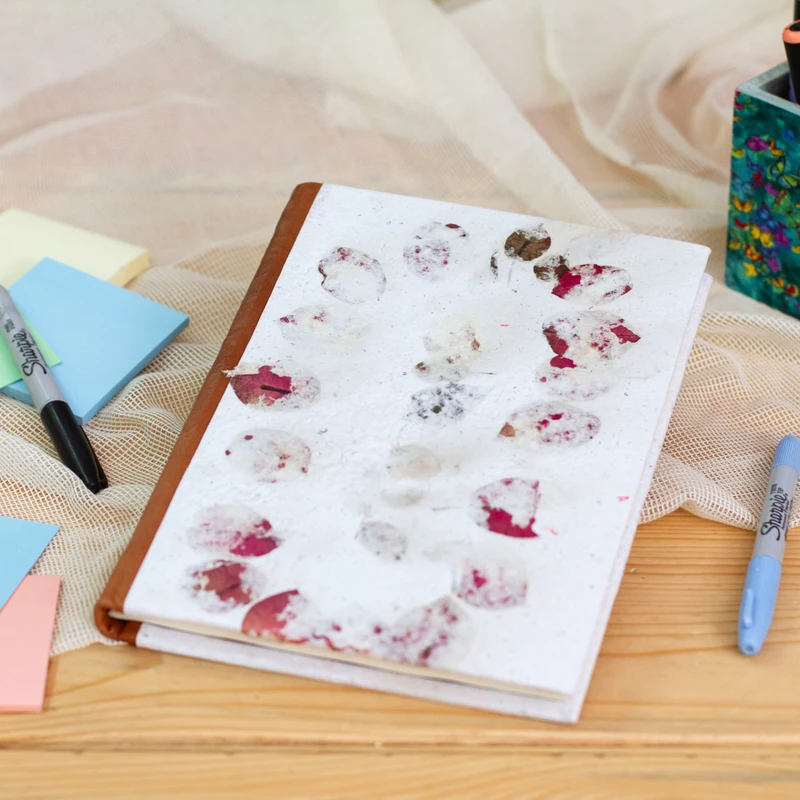 Artisan Indira Flores of Mexico binds this pretty journal by hand, using amate paper embedded with bougainvillea flower petals for the cover. The journal contains 90 pages of unlined, recycled paper and features a suede binding.