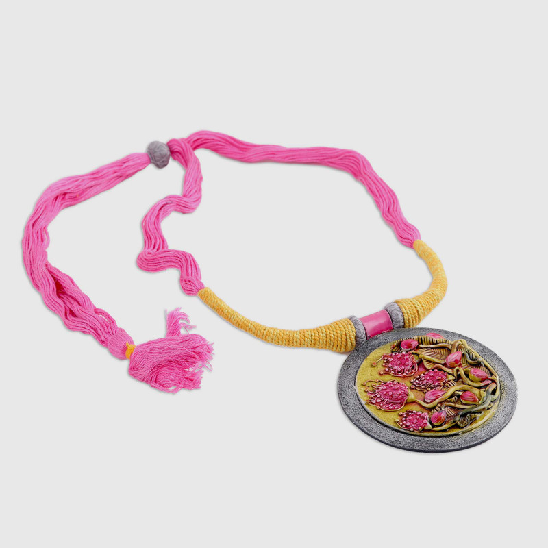 Inspired by the natural beauty of underwater plants and the uniqueness of the pincushion protea flower, Indian artisan Aditi designs this gorgeous necklace using ceramic. The circular pendant is neatly carved by hand, and painted using an eclectic palette of colors. The artisan finishes their design with lacquer to give it a brilliant sheen. The cotton sliding knot allows the delightful necklace to be adjusted to the desired length.
