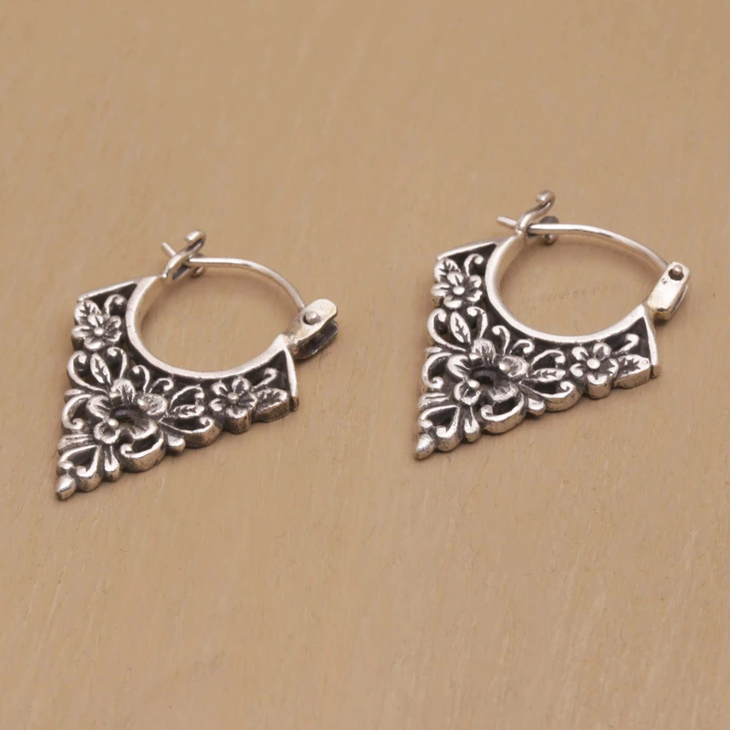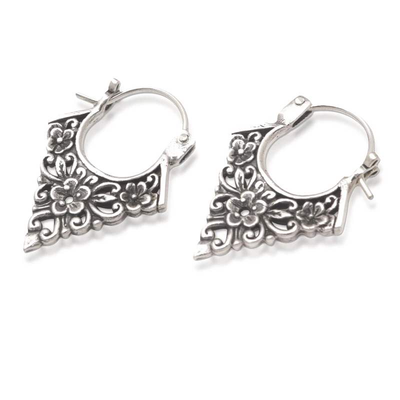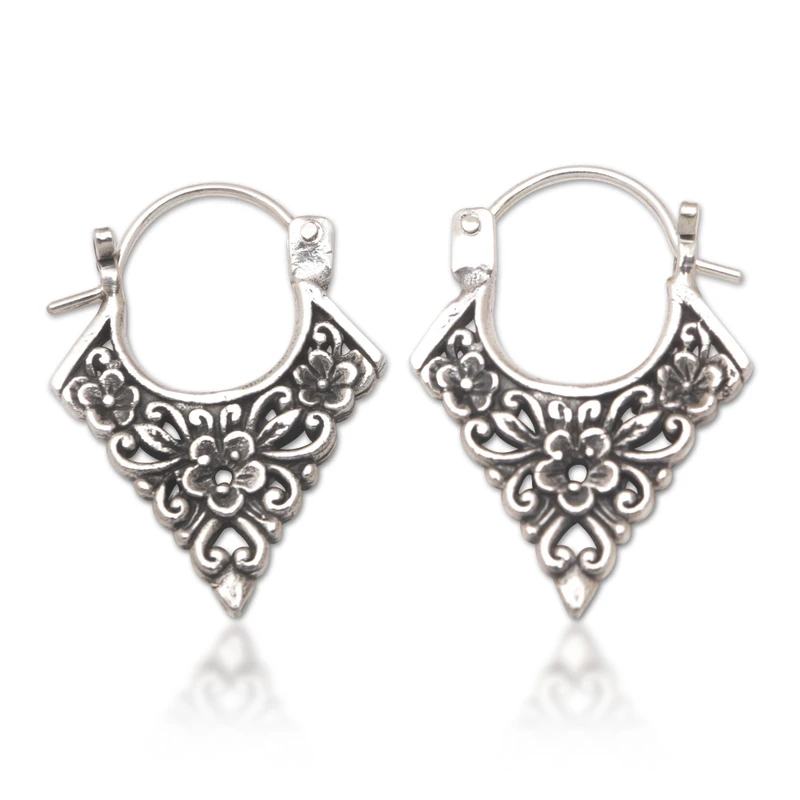 Hoop earrings are crafted of sterling silver, elaborated with intricate floral motifs within pointed shapes. Presented by Putu Putri, this accessory celebrates Balinese craftsmanship.