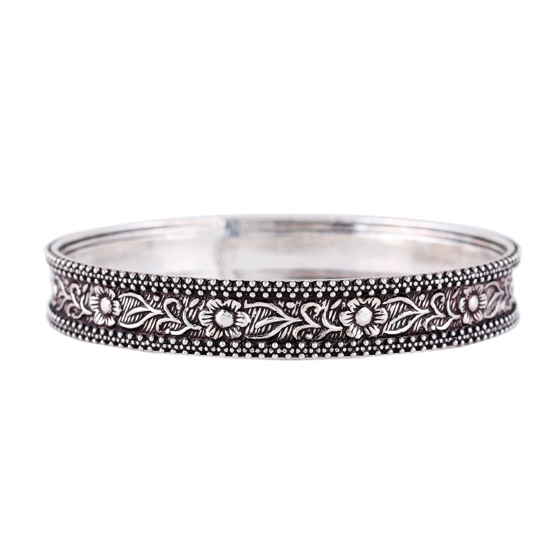 Bhavya Jain's newest design shines stunningly on any occasion! Crafted from sterling silver, this bangle bracelet features a polished finish that enhances its floral and leafy-themed structure, whose exquisite details create an ethereal aura while displaying India's high-quality jewellery art.