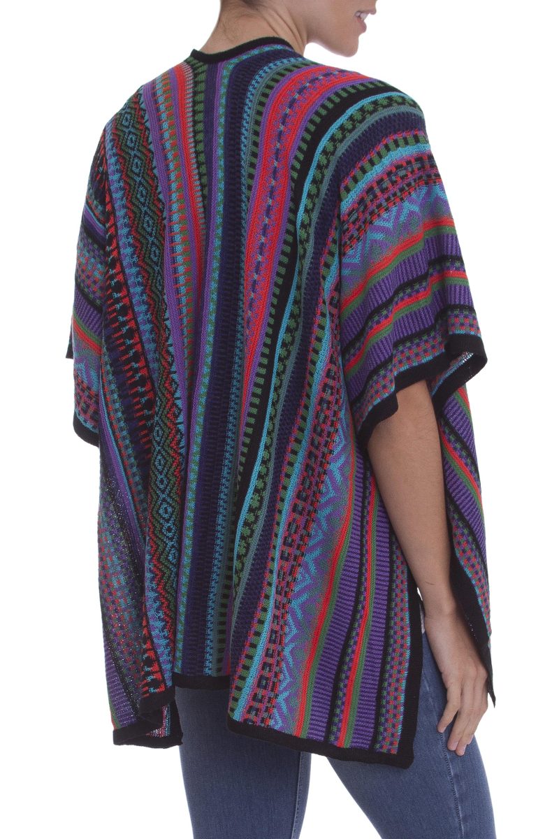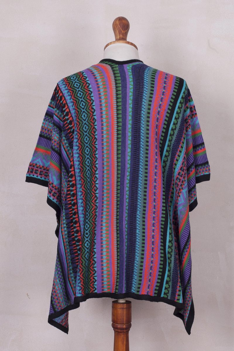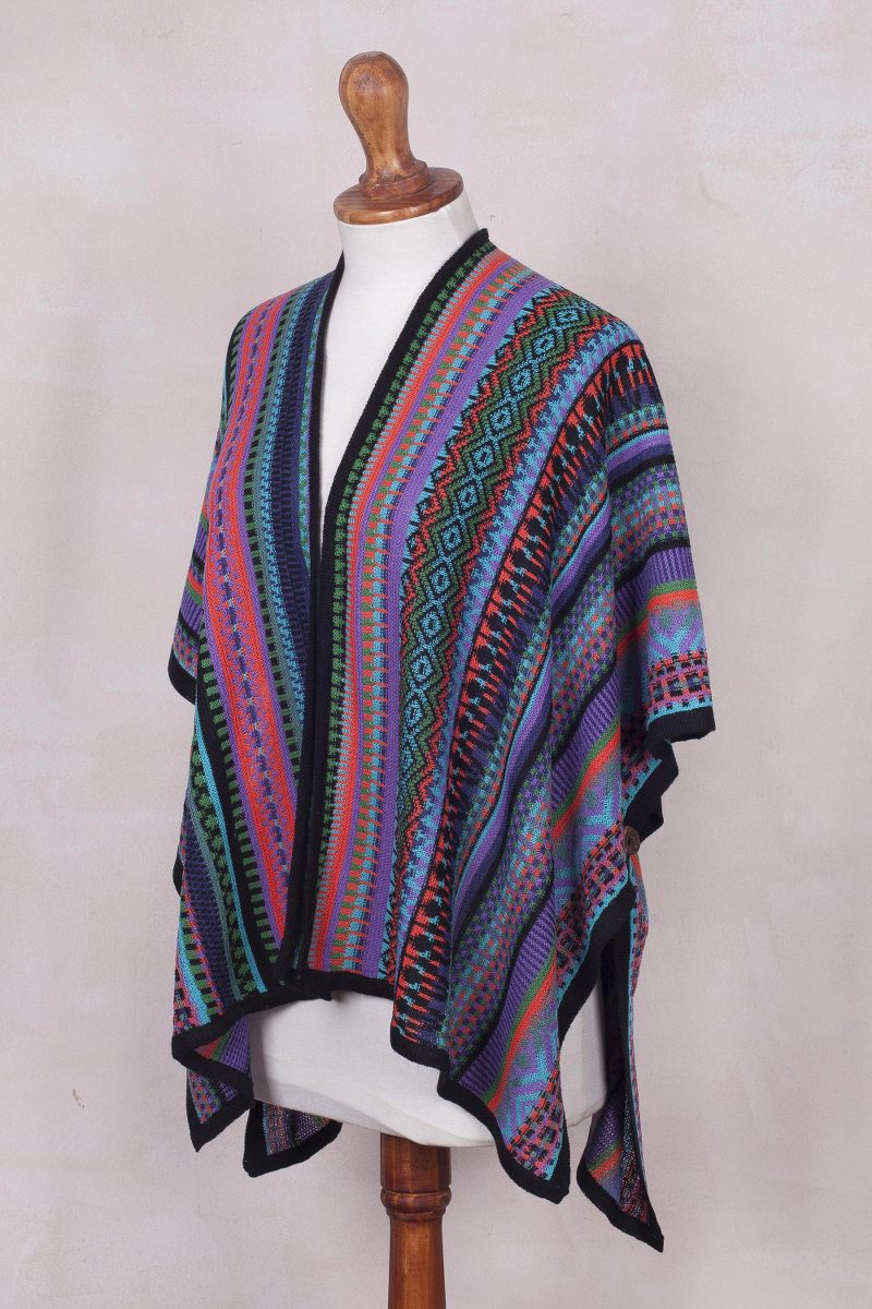 Alfredo Falcon of Peru designs this striped acrylic kimono-style ruana with bold colors and a mixture of geometric motifs. A touch of baby alpaca, the fine fleece from the season's first shearing, adds to the ruana's warmth and feel. Coconut shell buttons define a sleeve when buttoned. Lightweight, the ruana makes a wonderful layering piece.