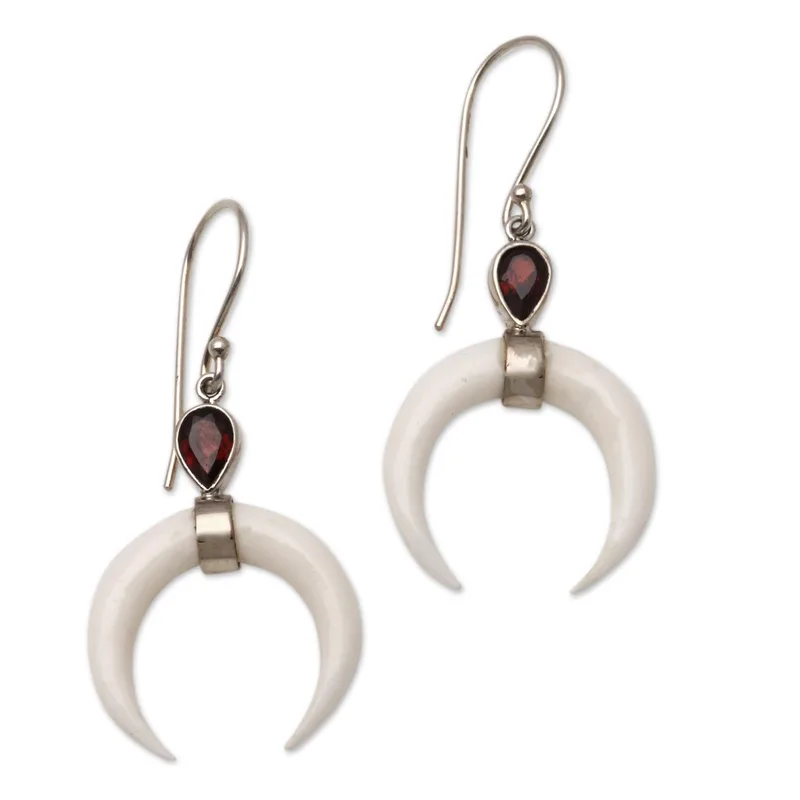 Named after the beautiful Sanur Beach in Bali, these dangle earrings are crafted by Made Wardika. Sleek crescents are hand-carved from bone and wrapped in polished sterling silver. They are crowned with sparkling garnet teardrops.