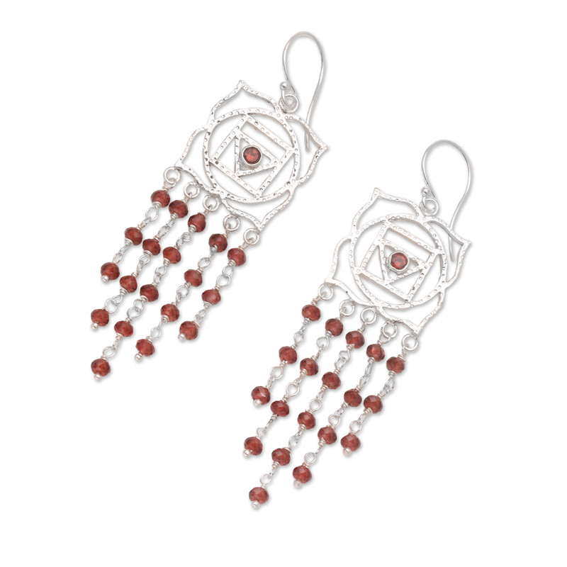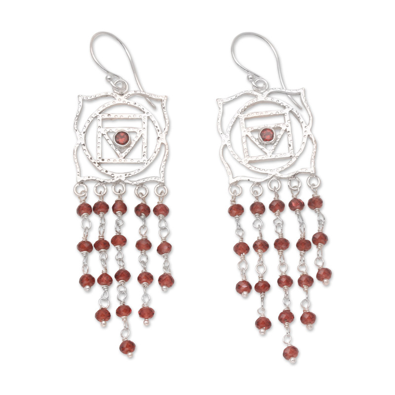 Portraying the first chakra--which is said to symbolize safety, security, stability--Wayan Trisna's dangle earrings glow with crimson gemstones. The Balinese artisan uses sterling silver to hand craft the openwork chakra motif, suspending petite garnet beads below.