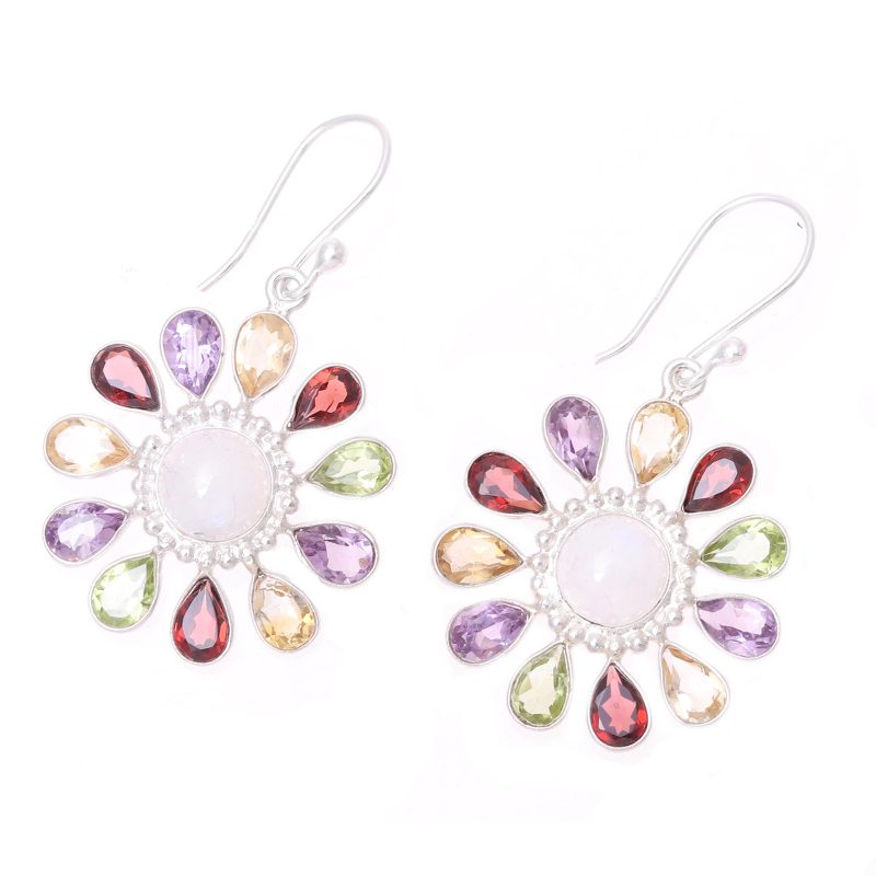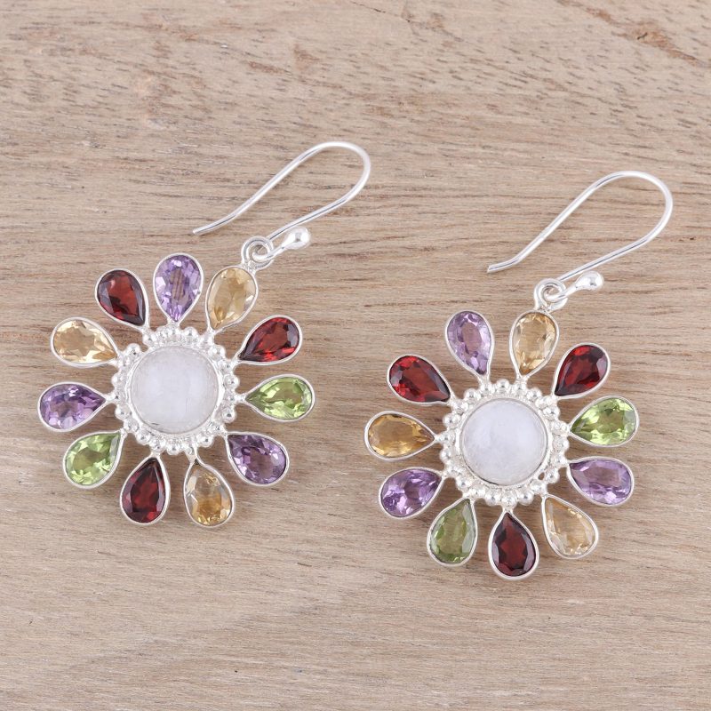 Backed by our 100% Happiness GuaranteeLike a rainbow of rays emanating from a glowing sun, faceted teardrops of garnet, amethyst, citrine and peridot encircle a round cabochon of rainbow moonstone. All set in sterling silver, the rainbow moonstone is ringed with sterling silver in a dot motif. Neeru Goel of India presents this dazzling pair of dangle earrings.
