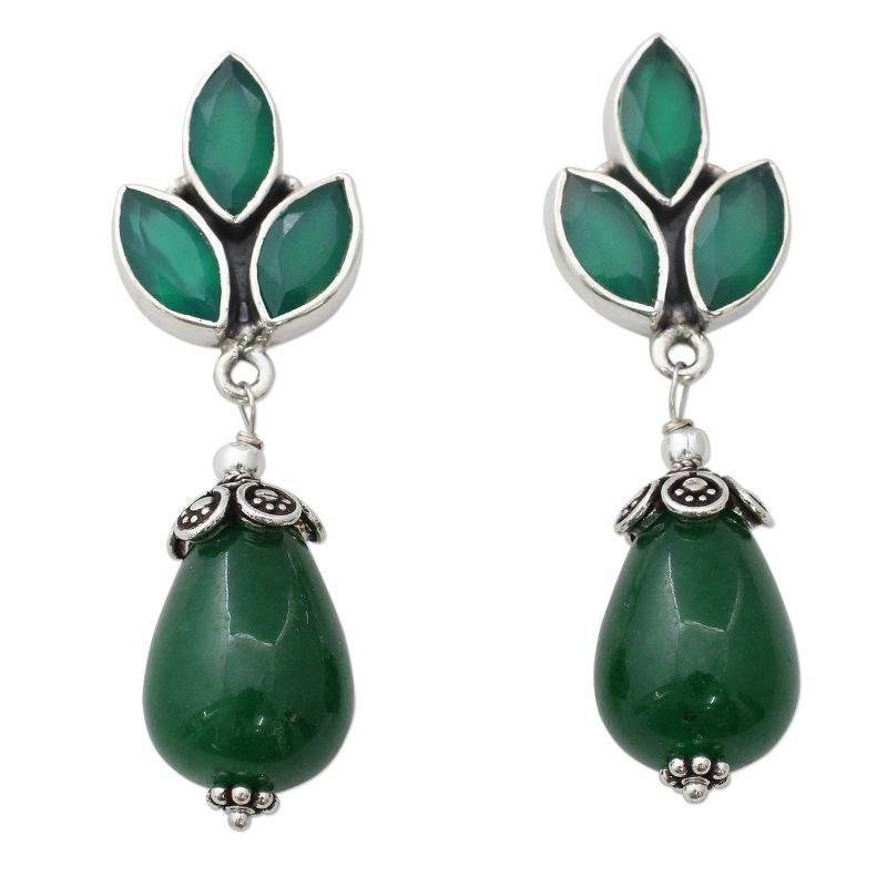 Exquisitely beautiful, these artisan crafted earrings come from India's Neeru Goel. The sterling silver earrings feature glossy dyed green onyx leaves and dyed green chalcedony in a harmonious contrast of colors.