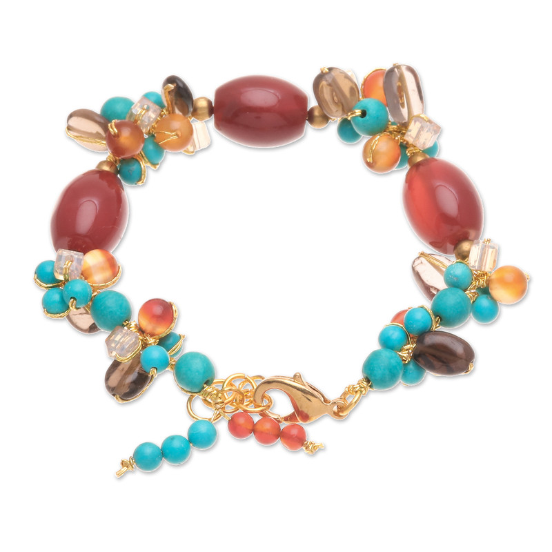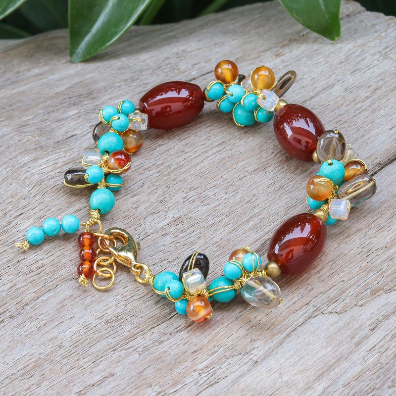 Looking for accessories to bring a touch of colour and vibrancy to your wrist? Thailand's Nareerat has got you covered with this dreamy multi-gemstone beaded bracelet. Featuring a breathtaking blend of chalcedony, howlite and smoky quartz complemented by glass and brass beads, this bracelet will also let you shine thanks to its golden metallic thread accents and 18k gold-filled brass clasp and extender chain.