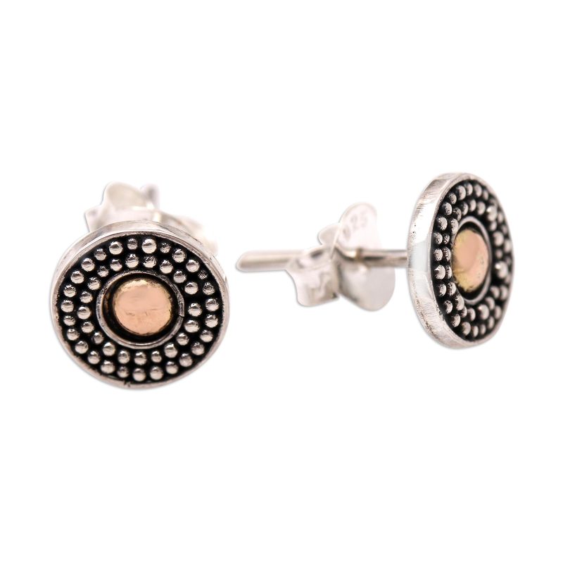 With their golden centres, Sukartini's petite stud earrings pack a big punch. Balinese artisans centre the earrings with 18k gold-plated sterling silver circles, while sterling silver rings frame the gold centre with a textured dot motif.
